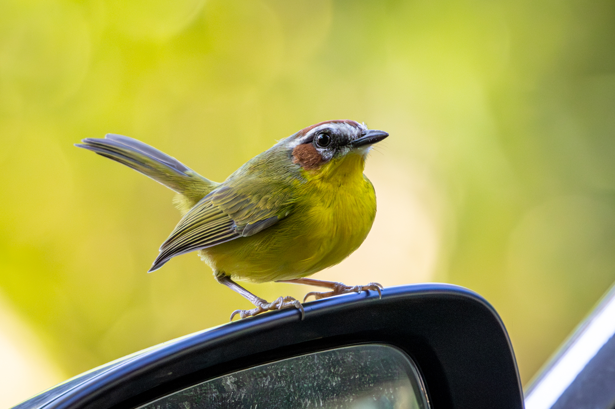 I haven’t loaded all my pics from the trip into my computer yet, so I don’t even know how many shots I took (lots). Here’s a cute one of a Chestnut-capped Warbler (formally Rufous-capped Warbler) that was in love with itself via a car’s side-view mirror I took on the hotel grounds the first day there in San Jose.