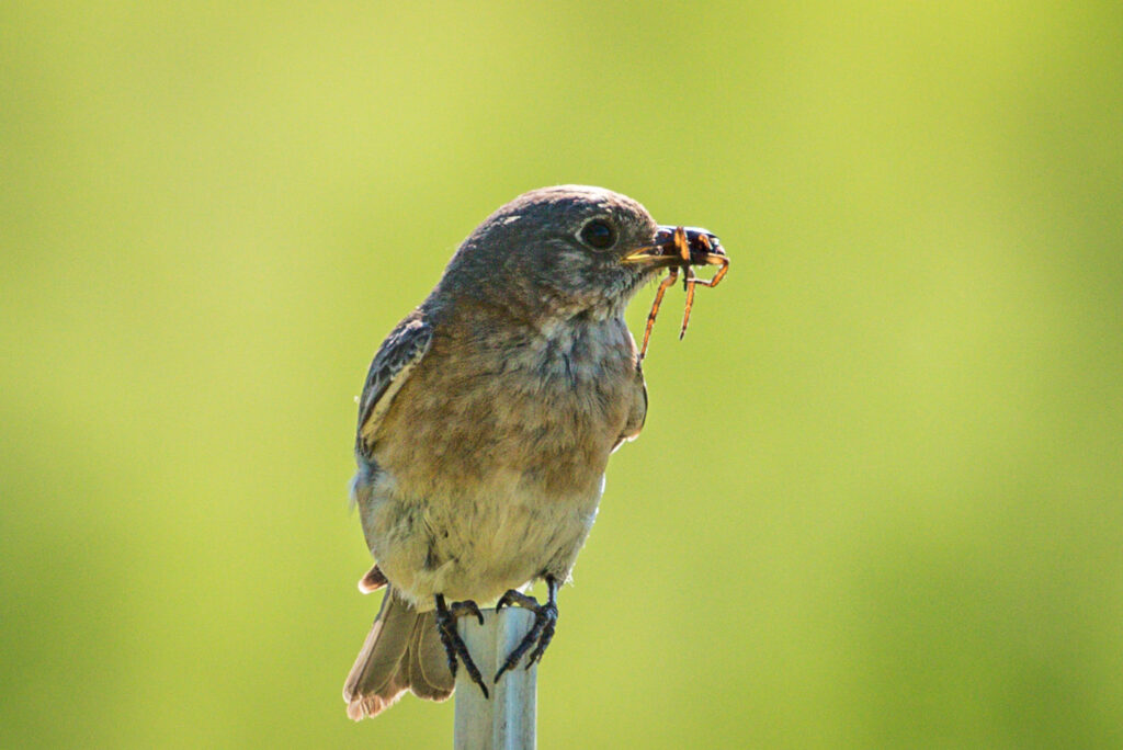 Even so, I liked the bug in its beak so I used my photo editor to see if I could extract a usable picture. I use (and love) Lightroom but every photo editor will have these same adjustments – even the photo editor that comes with your smartphone. The most important adjustment is Shadows. By increasing the Shadows adjustment, the photo editor lightens everything in the light range of typical shadows. For the picture above I increased the Shadows in Lightroom to 100 (although it’s not always necessary to push it up all the way). Then I adjusted the Contrast slider to improve the difference between the lightest and darkest areas in the photo. Finally I often have to increase the Exposure slider because the Shadows and Contrast adjustments often darken the overall pic. Here’s my finished product after adjusting the Shadows, Contrast, and Exposure: