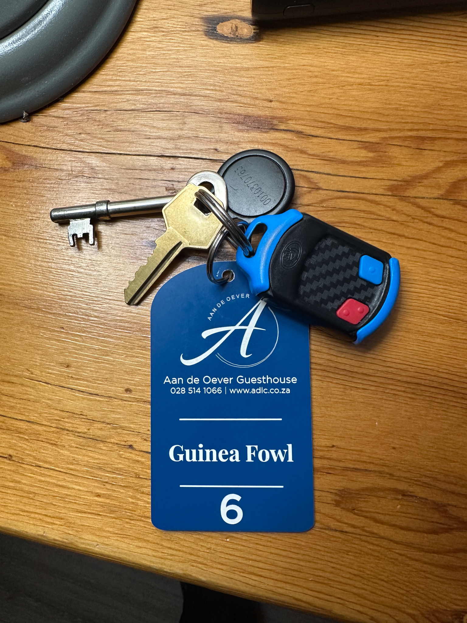 After driving through miles and miles of farmland and pastures we arrived at our hotel in Swellindam, which is about 100 miles due east of Cape Town. The Aan de Oever Guesthouse was nestled within a quiet residential neighborhood and we were assigned to the Guinea Fowl room – here are the keys for the room: