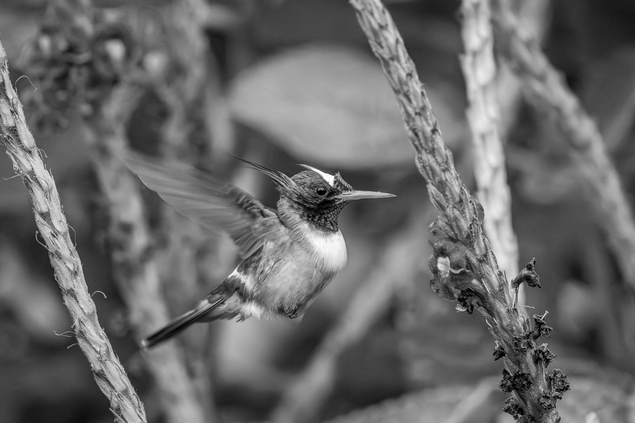 I mean, what’s not to like – beautiful bird captured in mid-flight, a sharp focus with an interesting background. One of our judges was Jen, who is an artist and uses colored pencils and painting to create her art. She took a minute to explain why she didn’t vote for my picture as the winner. The first thing she mentioned was that light-green leaf above the head of the bird was very distracting and suggested that the photo would have been better if I would have Photoshopped it out. I told her that I hadn’t even noticed that leaf, probably because I was so focused on the bird itself. Jen replied that sometimes she envisions a picture in black-and-white to see any distractions. Below is the same picture in black-and-white – and you can see how the leaf above the head stands out.