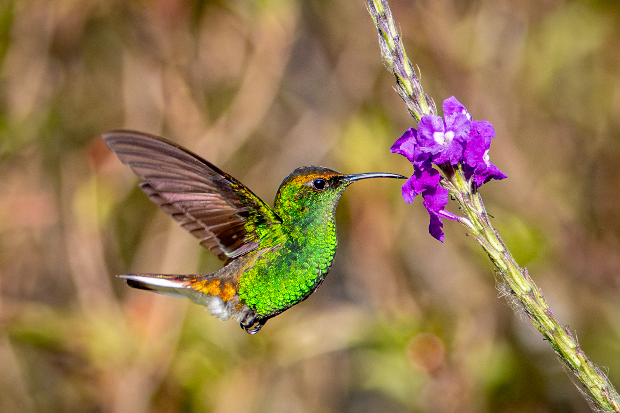 Here is a Black-crested Coquette feeding at some delicate flowers. Note the fine feather strands flowing from its crest over its back. Good light allowed me take this shot at 1/3200th of a second.
