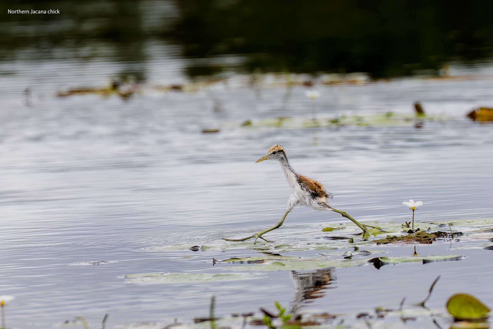 I almost overlooked this photograph by Bajadreamer because the subject was so small. It is a Northern Jacana chick making its way across a pond and look how small its body is compared to its huge feet! It uses those feet to walk on lily pads; smaller feet would have just sunk into the water. It barely has any feathers, but so cute! Bajadreamer didn’t think the shot was very good but I think it is GreatBirdPic quality through and through.