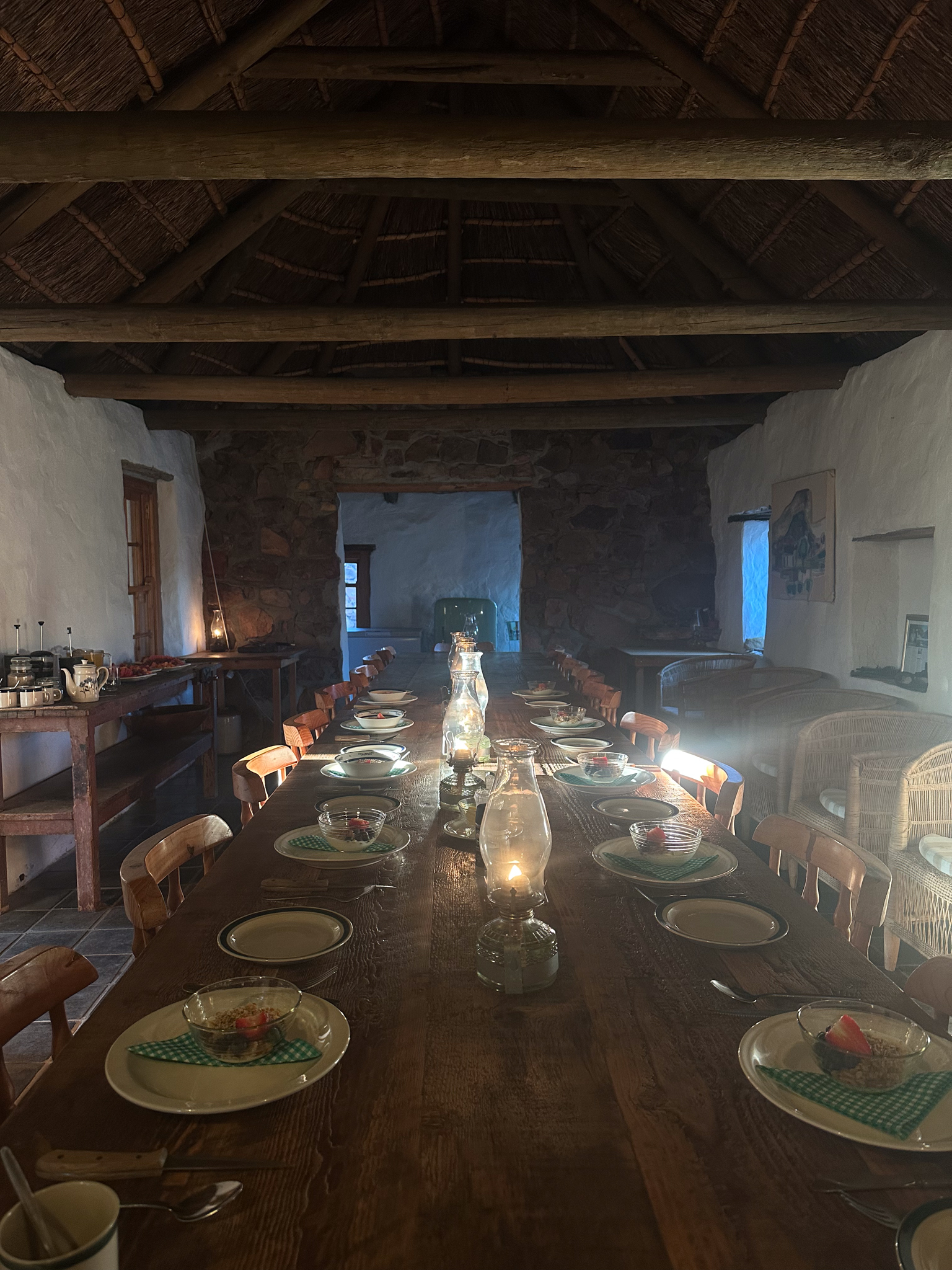 We were warned ahead of time – Klein Cedarberg had no cell service and no electricity in the rooms, so we charged our camera batteries before arriving and turned off our cellphones after we got there. We were shown to our cottage which had a thatched roof up top and a glass-enclosed fireplace inside.