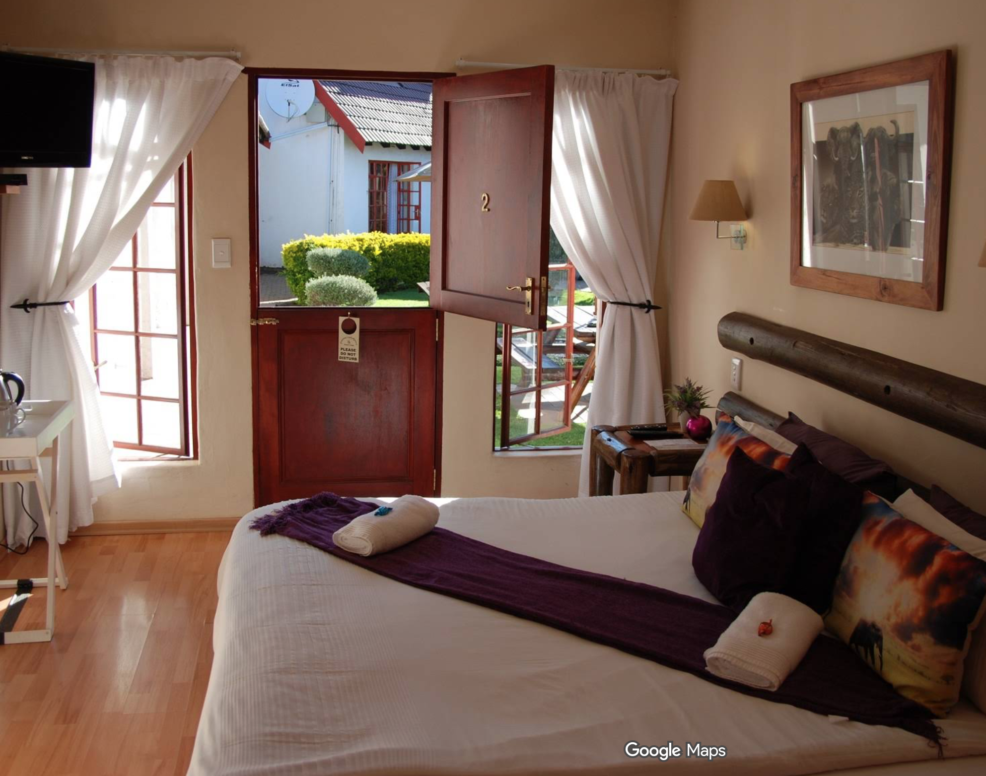 We were loaded on a van and driven to the Journey’s Inn hotel, tucked within a residential area northeast of downtown Johannesburg. The door to each comfortable room was a Dutch door; a waist-high split allowed you to open the top half and look out into the courtyard (recall that South Africa was colonized by the Dutch for many years). Here’s a shot of our room someone else took and posted on Google Maps.