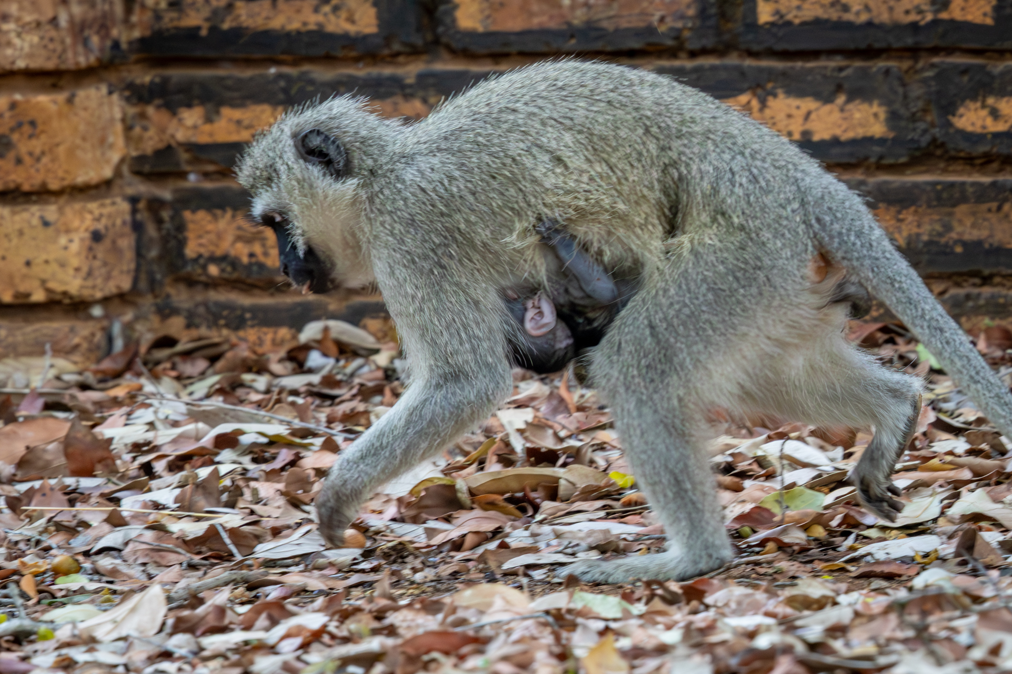 So even before breakfast we picked up six Lifers! We probably could have found more but today was moving day – we were leaving Berg-en-Dal and traveling to our last lodging of the trip at Lower Sabie (still in Kruger). After loading up our luggage in the trailer we climbed onboard, only to find that our snacks for the day had already been opened – probably by one of the Vervet Monkeys that were going through the Rest Camp. Below is one carrying her baby.