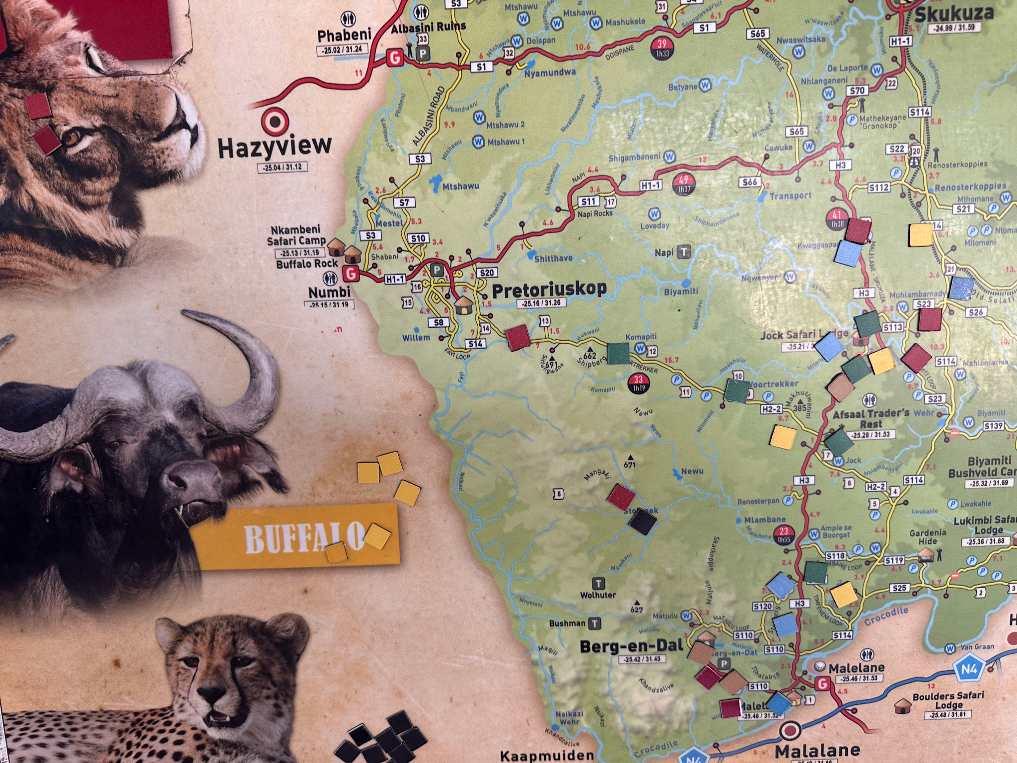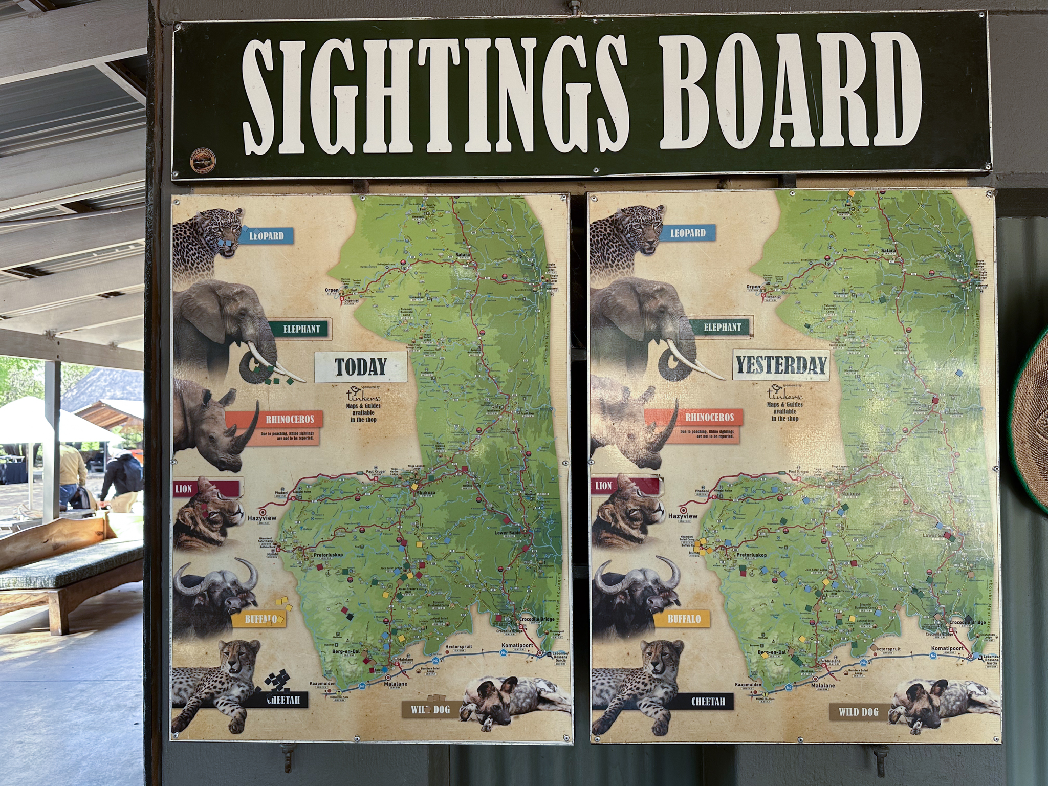 I was fascinated by the Sightings Board posted at the entrance of the picnic area. Visitors put a small color-coded metallic square on the map for each type of animal they saw that day. On the left, yesterday’s map contains all markers of sightings from the day before. On the right are the markers of sightings so far for the current day. In the closeup below you can see the Water Buffalo’s color was yellow.