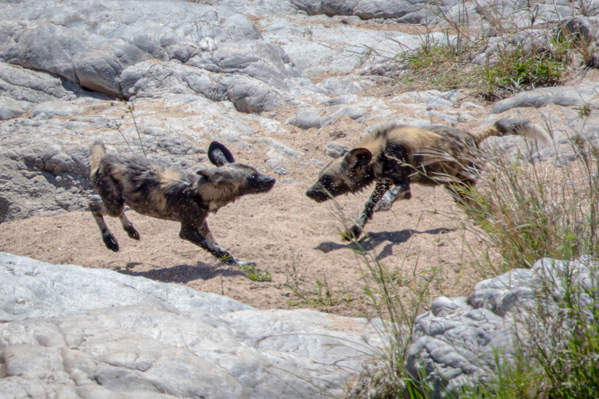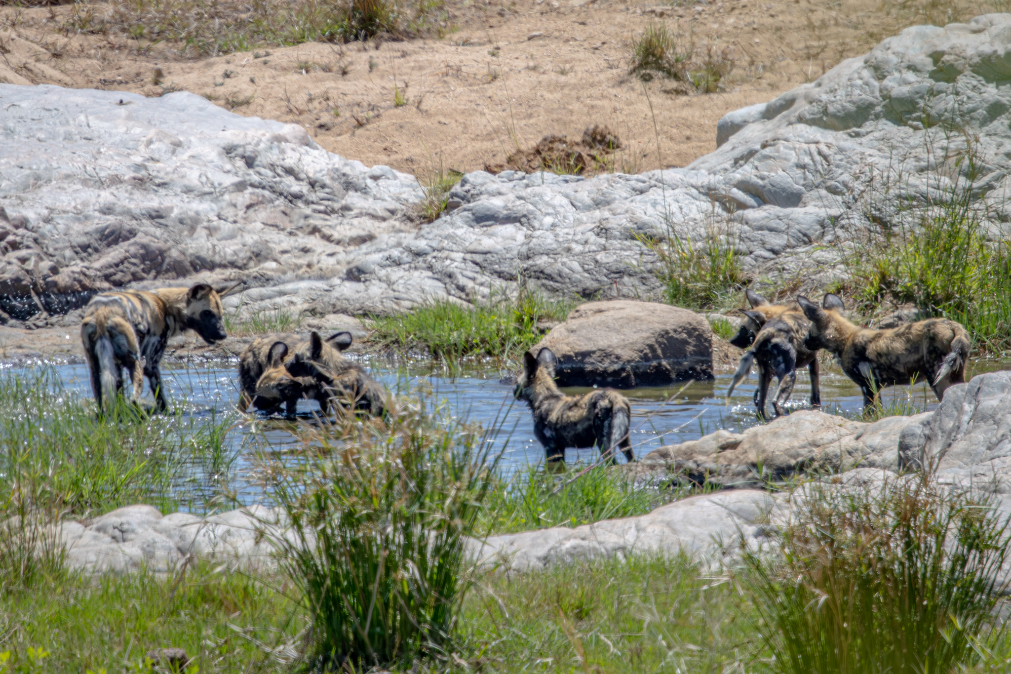 After lunch we drove on and found a pack of wild dogs enjoying a watering hole. In the second picture a couple of pups frolic and play.