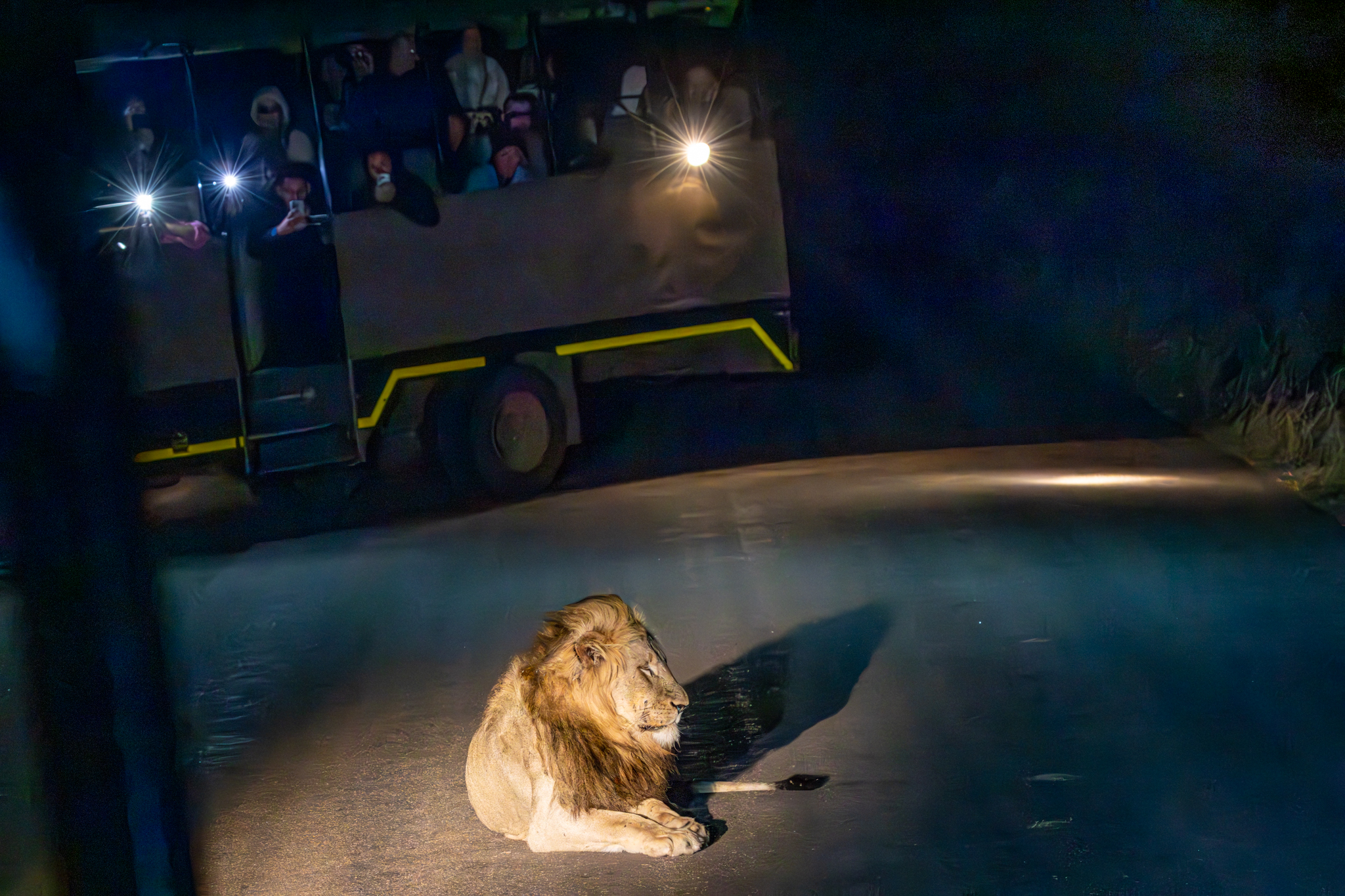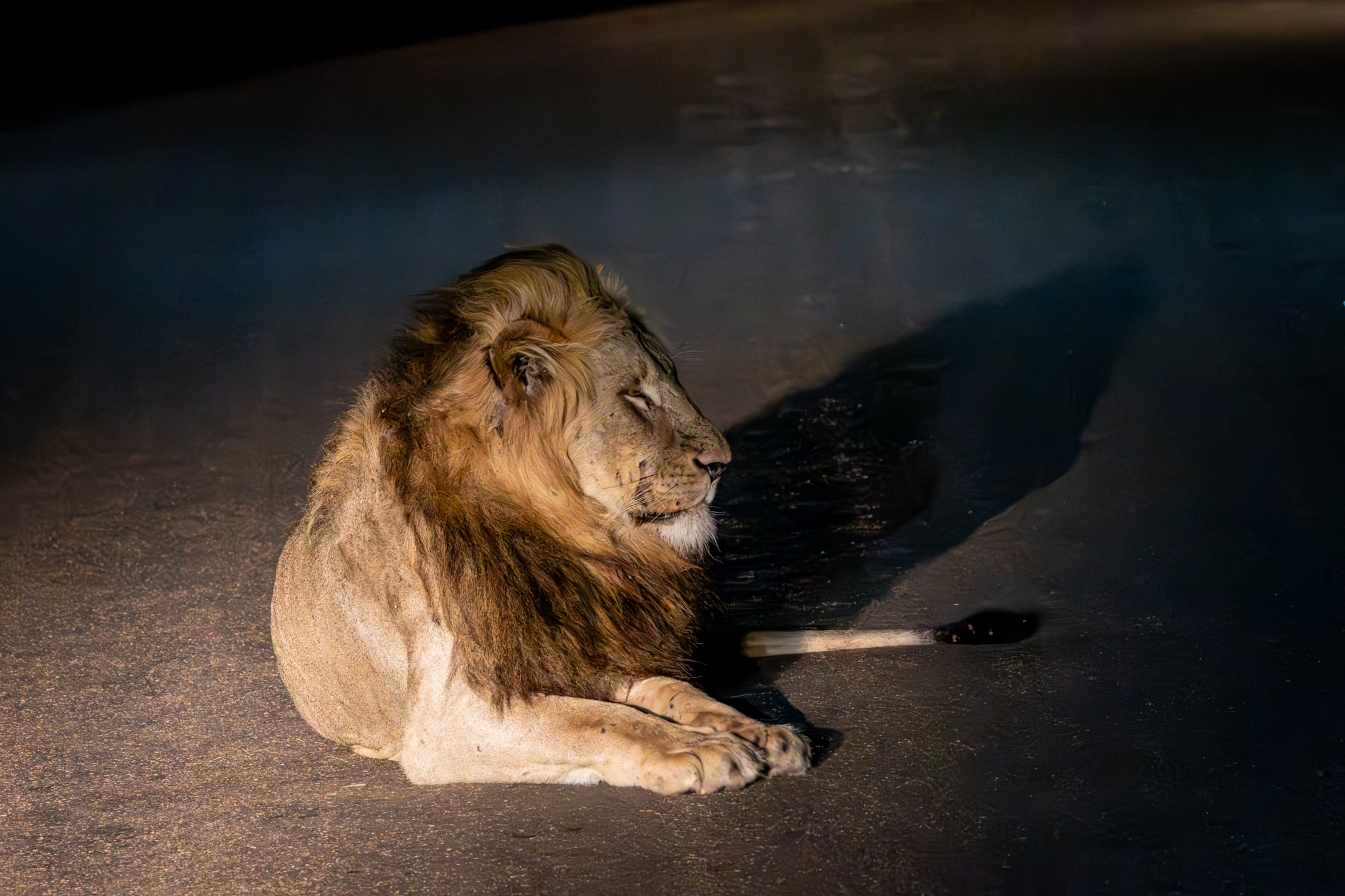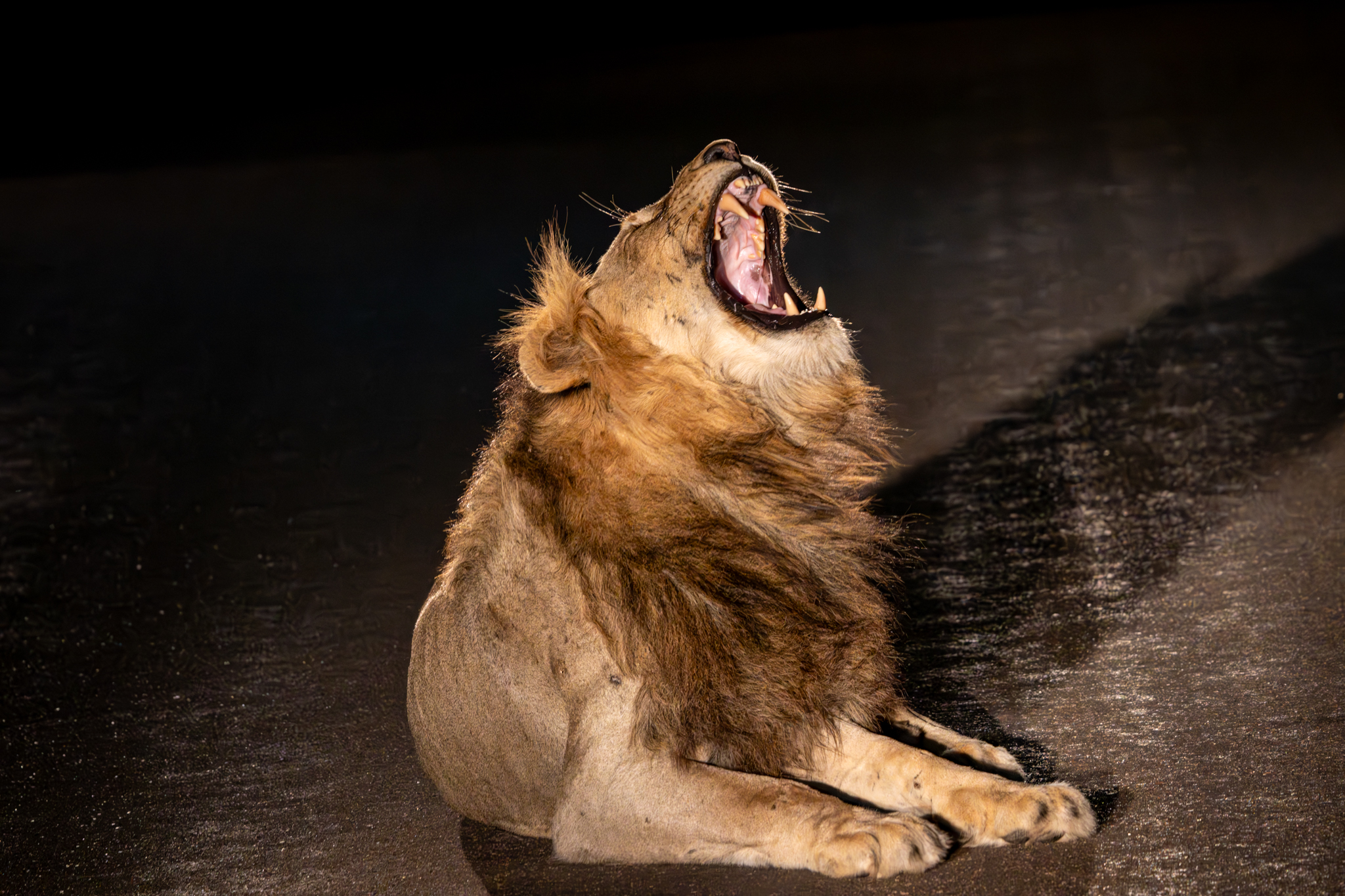 There is a strict prohibition from driving around Kruger at night for two reasons. For one, it would be difficult to see wildlife crossing the road in the darkness – collisions could occur. More importantly, it is designed to keep poachers from driving around and killing rhinos and other big game animals. However the park does arrange its tourist busses to leave the compound after dark and look for animals. We signed up for a drive our first night at Lower Sabie and saw some groups of Impalas alongside the road. The big thrill came from finding this huge male Lion lying in the middle of the road (presumable to keep warm). In the first picture you can seen another of the tourist busses the other side of the lion. I would like to say that in the third picture the lion was letting out a mighty roar, but no – it was a yawn. After about 20 minutes there the lion sauntered off to the side of the road to continue his rest.