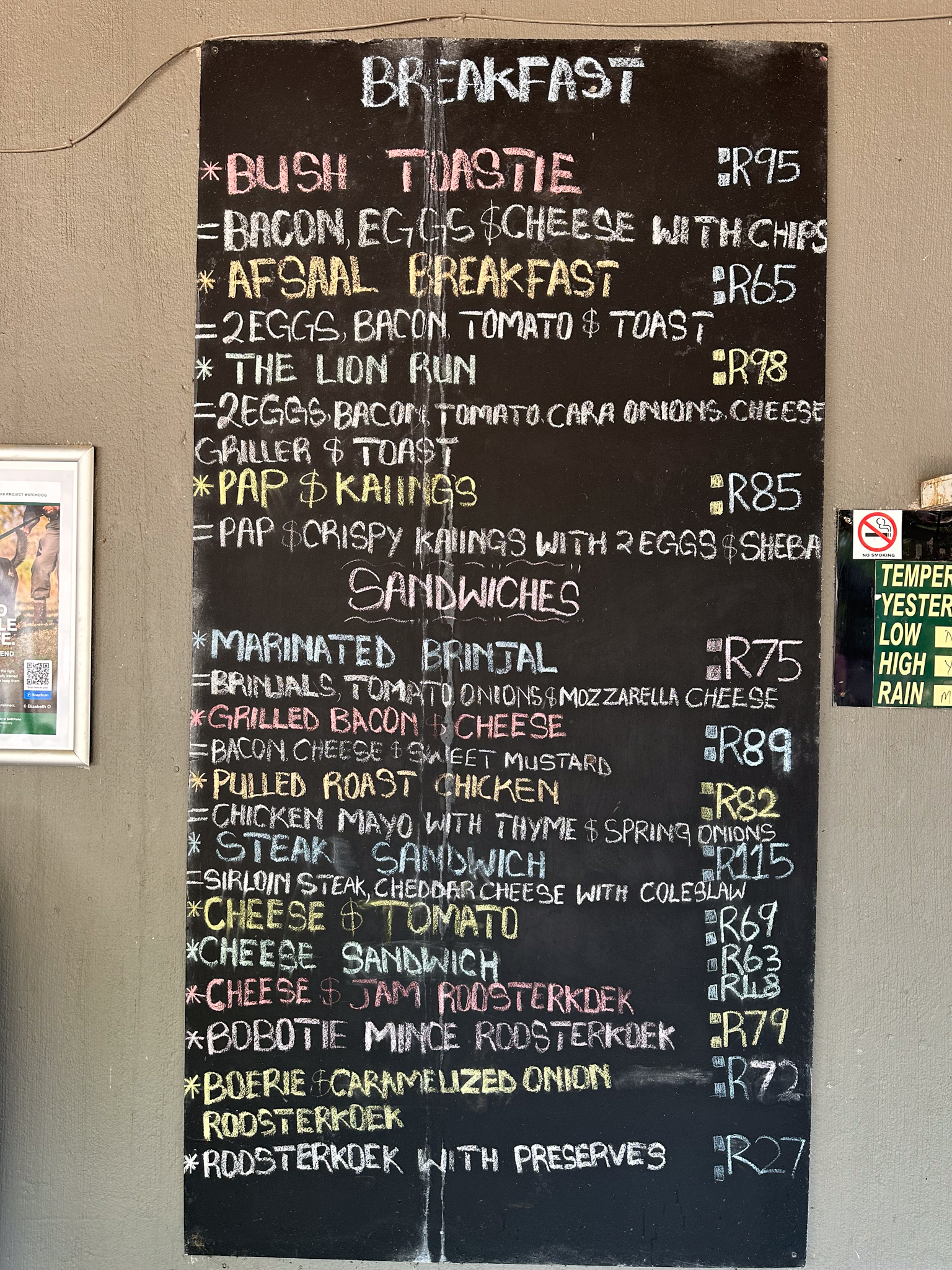 Servers came to our picnic area and took our orders, which we selected from a wide selection of breakfast and lunch meals. My favorites were the Lion Run and the Bush Toastie.