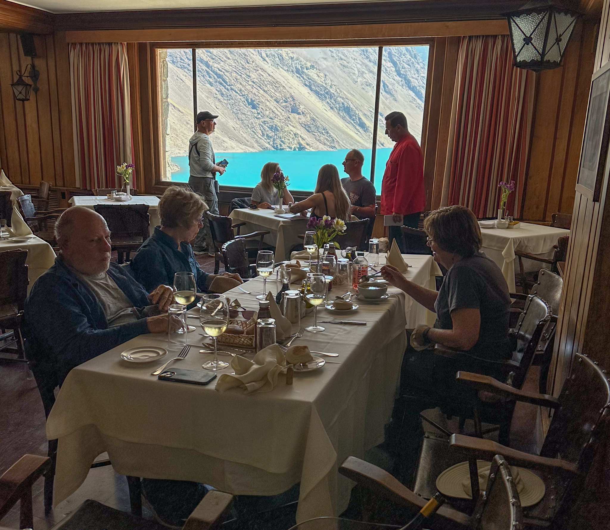 Once there we had lunch at Portillo’s ski resort. The corridors of the building were covered with autographed photos of many famous skiers who had trained or skied there. One large table in the dining room was occupied by members of the Argentinian Olympic Swim Team who were there training at the high altitude in the aqua-blue reservoir seen from our dining room window below.