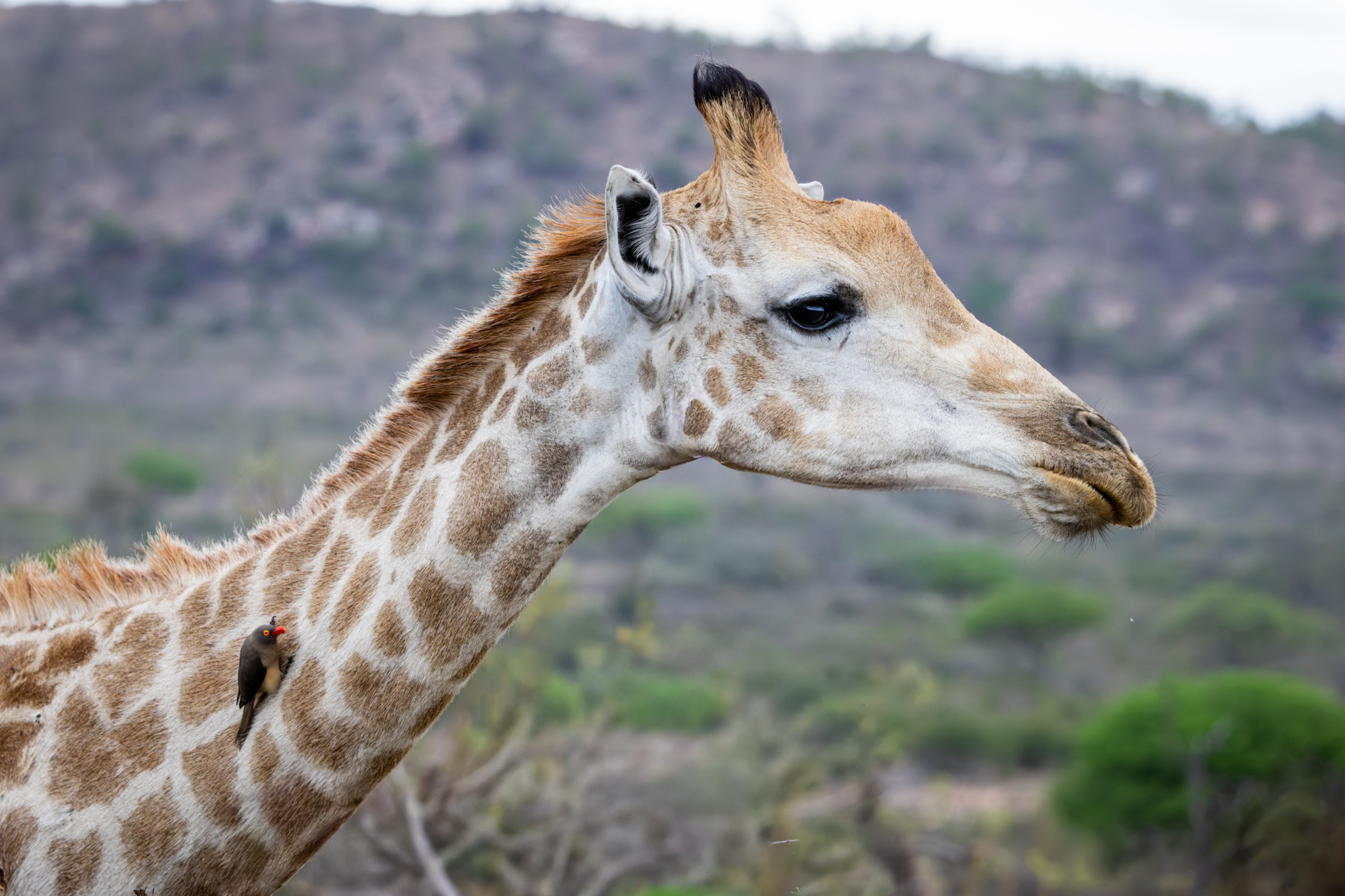 Look carefully and you’ll see a Red-billed Oxpecker feeding on bugs and parasites on the neck of this giraffe. Sometimes we would see 5-10 Oxpeckers on one giraffe. A closeup of an Oxpecker is below.