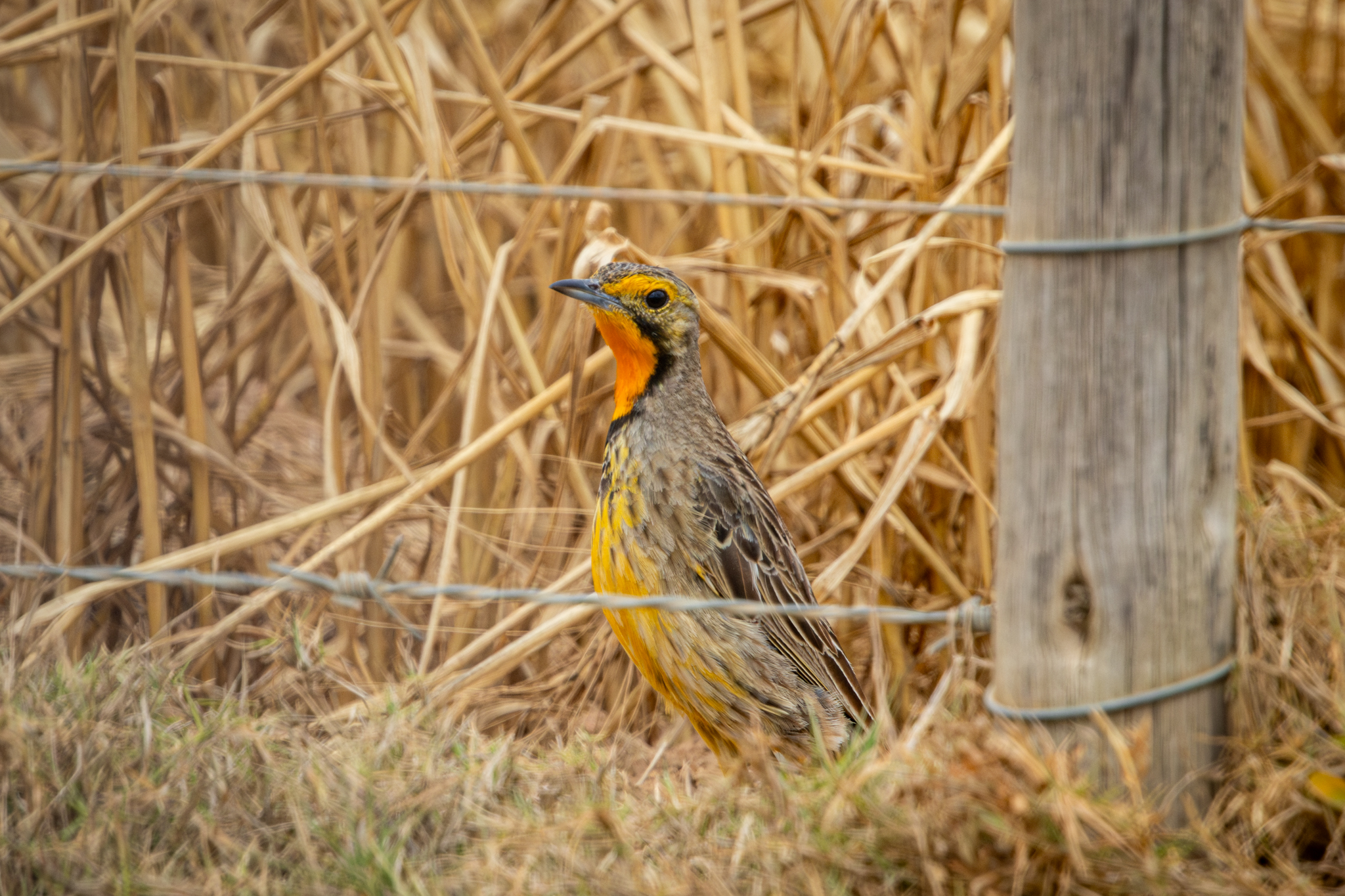 As we traveled through farm country in South Africa barbed wire lined either side of the two-lane road we were on, which makes excellent perches for grassland birds. Here’s an Orange-throated Longclaw peering across the road at us. It was reminiscent of an Easter or Western Meadowlark.