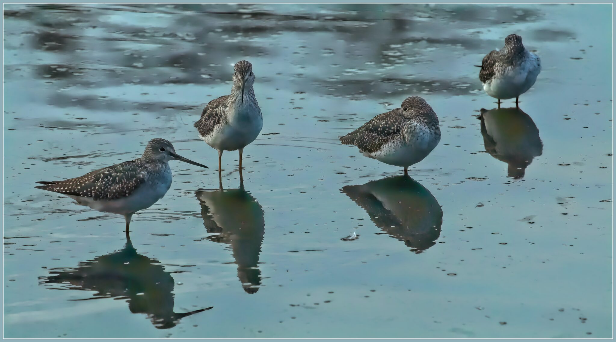 Greater Yellowlegs (Tringa melanoleuca) and their reflections.