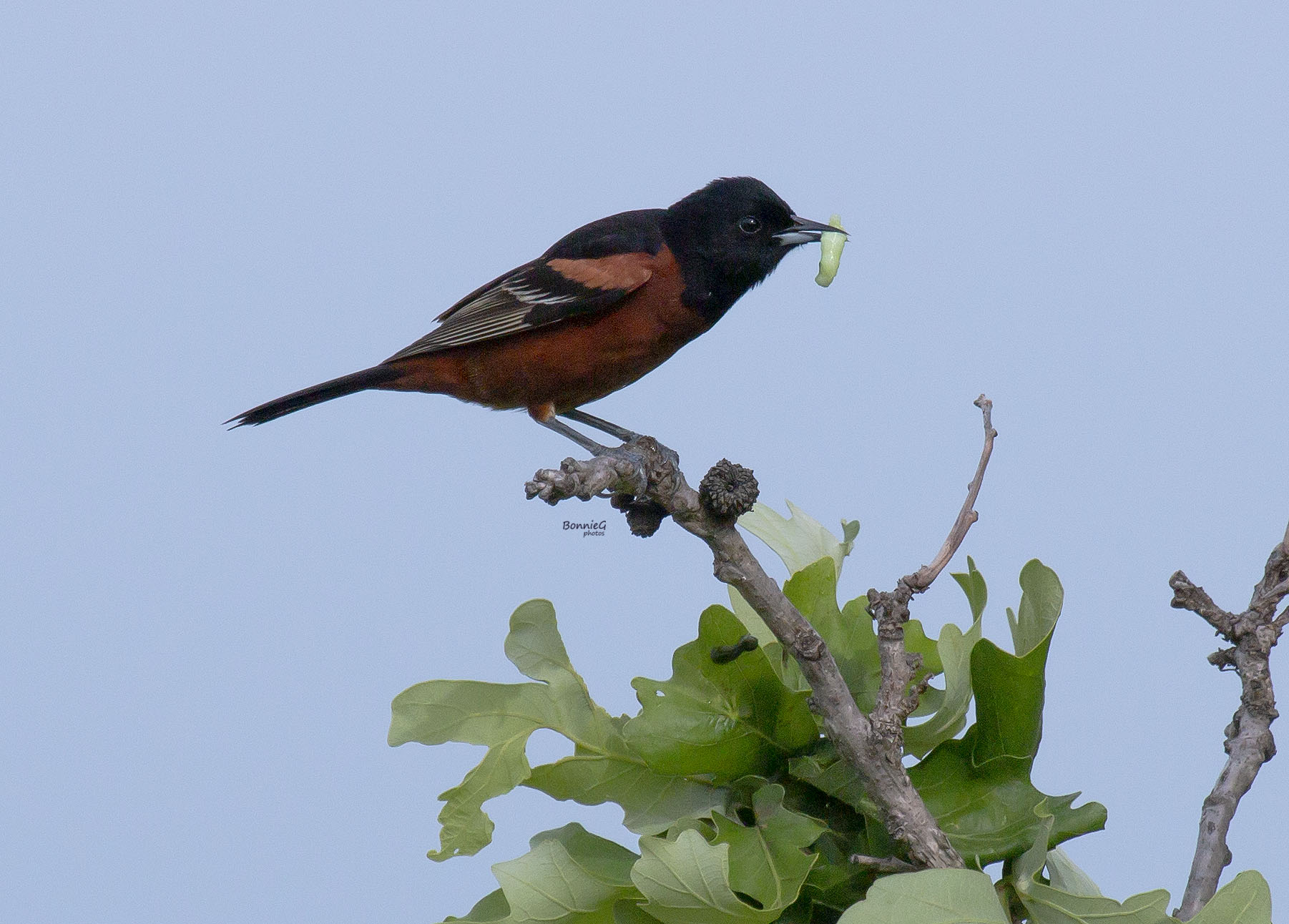 An Orchard Oriole caught a caterpillar to bring home to the nest.