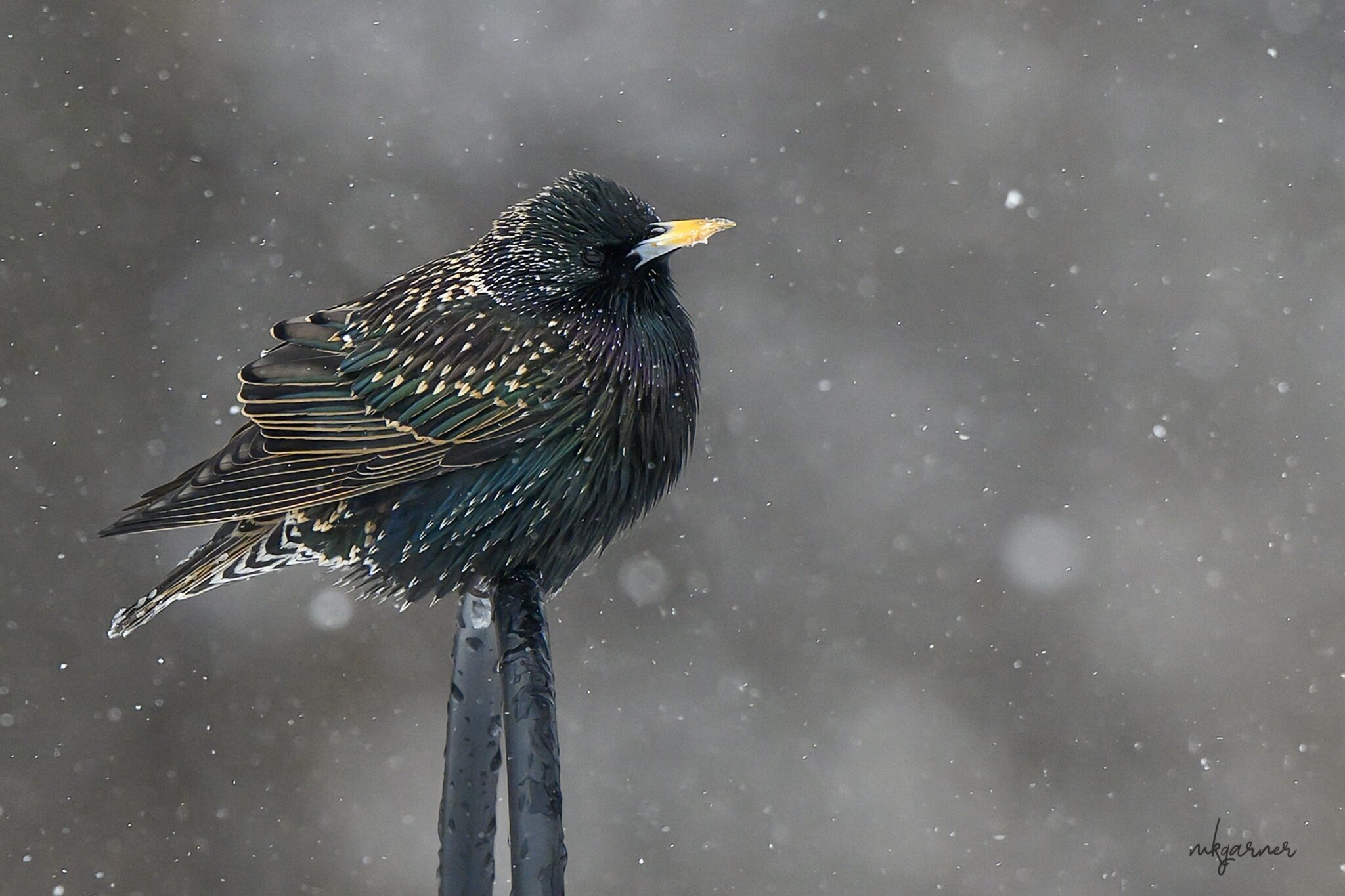 I love the composition of the starling in the snow! The snow is a great compliment to the spotted Starling. Well Done!