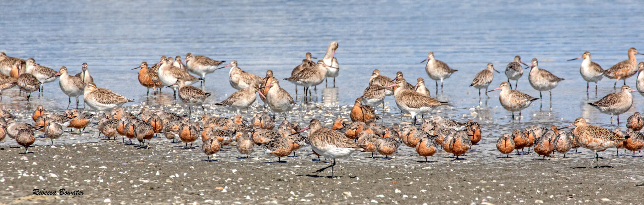 Red Knots and Bar-tailed Godwits in their breeding colours ready to fly to the Yellow Sea to feed, then onto Alaska tundra to breed. They return to NZ in Sept-Oct.
