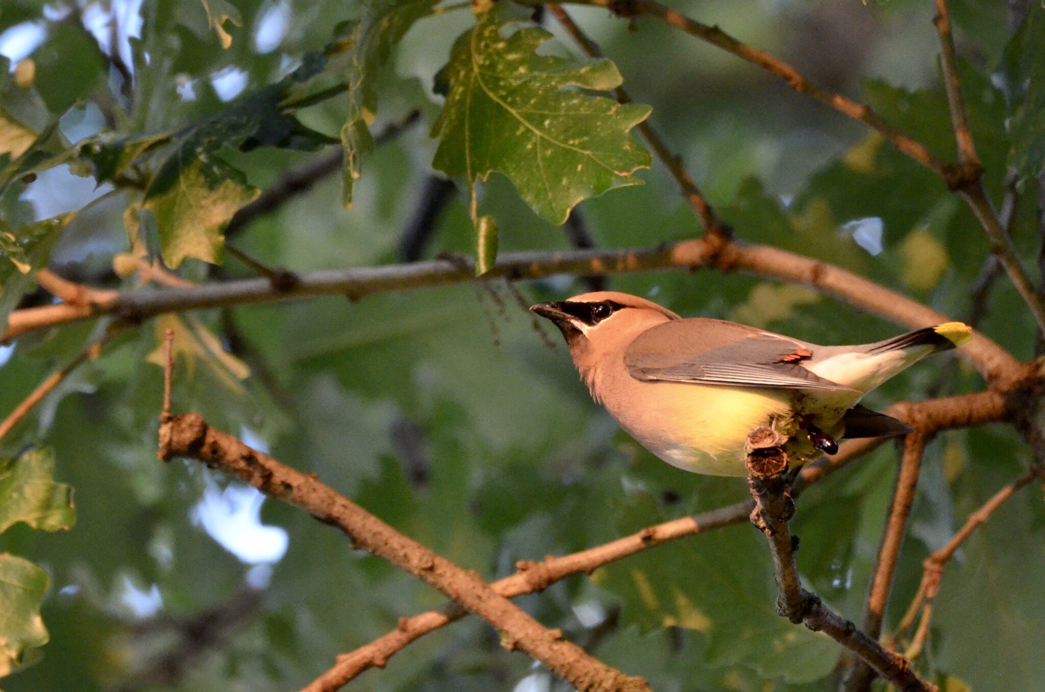 Cedar Waxwing perched in a tree at Bemis Woods. Question for the bird experts: What is the black shiny thing that appears to be protruding from its vent? I have several pictures with the same thing.