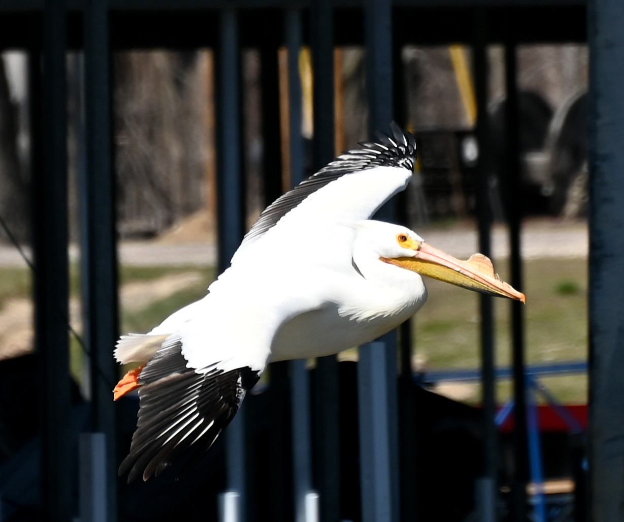 An American White Pelican is preparing to return to the water after being spooked away by a motorboat at the Twin Rivers Marina in Pike Station, Illinois.
