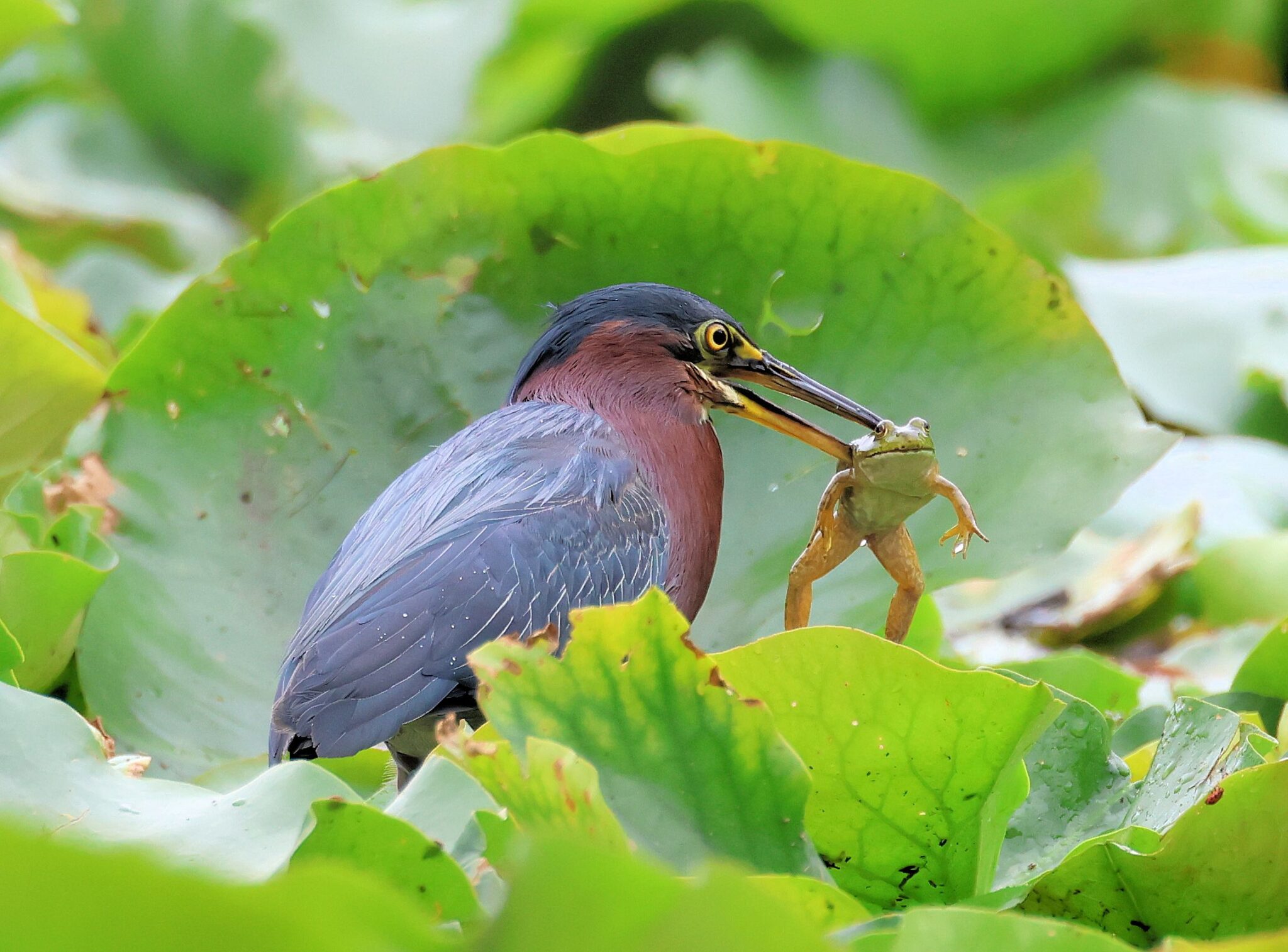 This Green Heron repositioned this poor frog dozens of times before finally throwing it back and swallowing it whole.