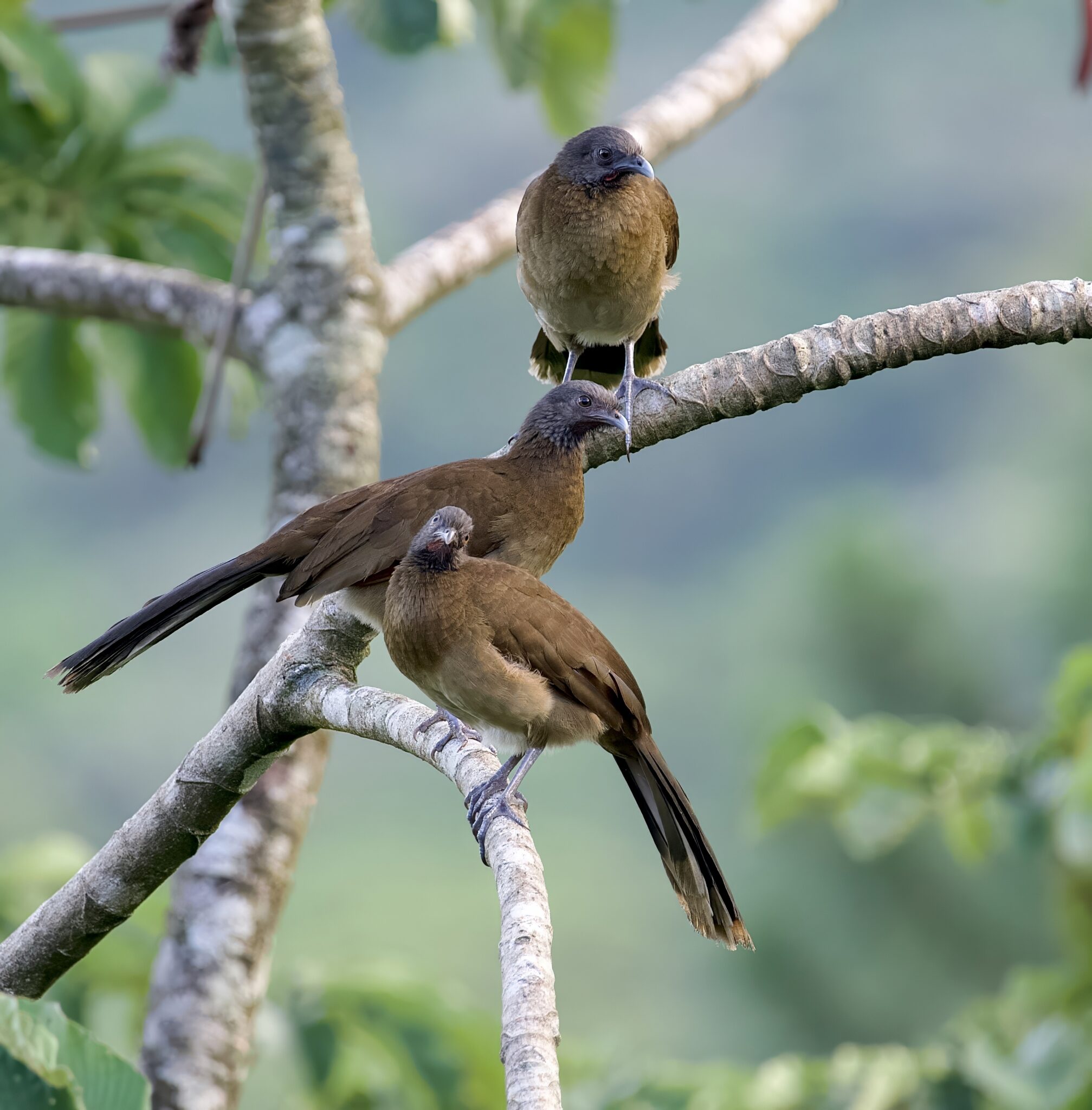 This trio flew in, posed and abruptly took off. They apparently travel in small groups. Note the small red dewlap (flap of skin) on their necks.