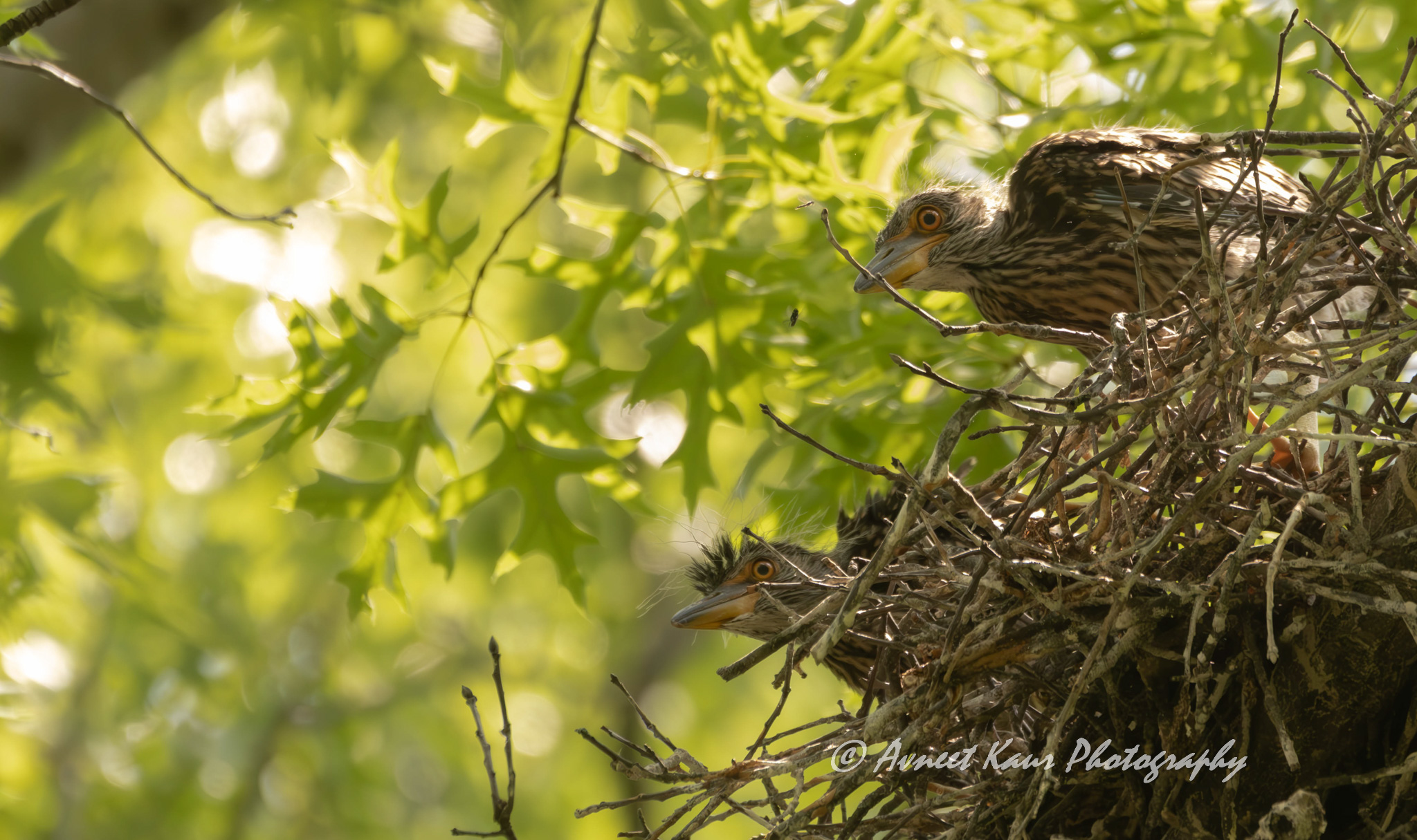Two juvenile yellow-crowned night heron chicks are perched in a nest woven among tree branches, surrounded by lush green leaves. Sunlight gently filters through the foliage, highlighting the intricate patterns on the birds’ feathers!!! June 11, 2025