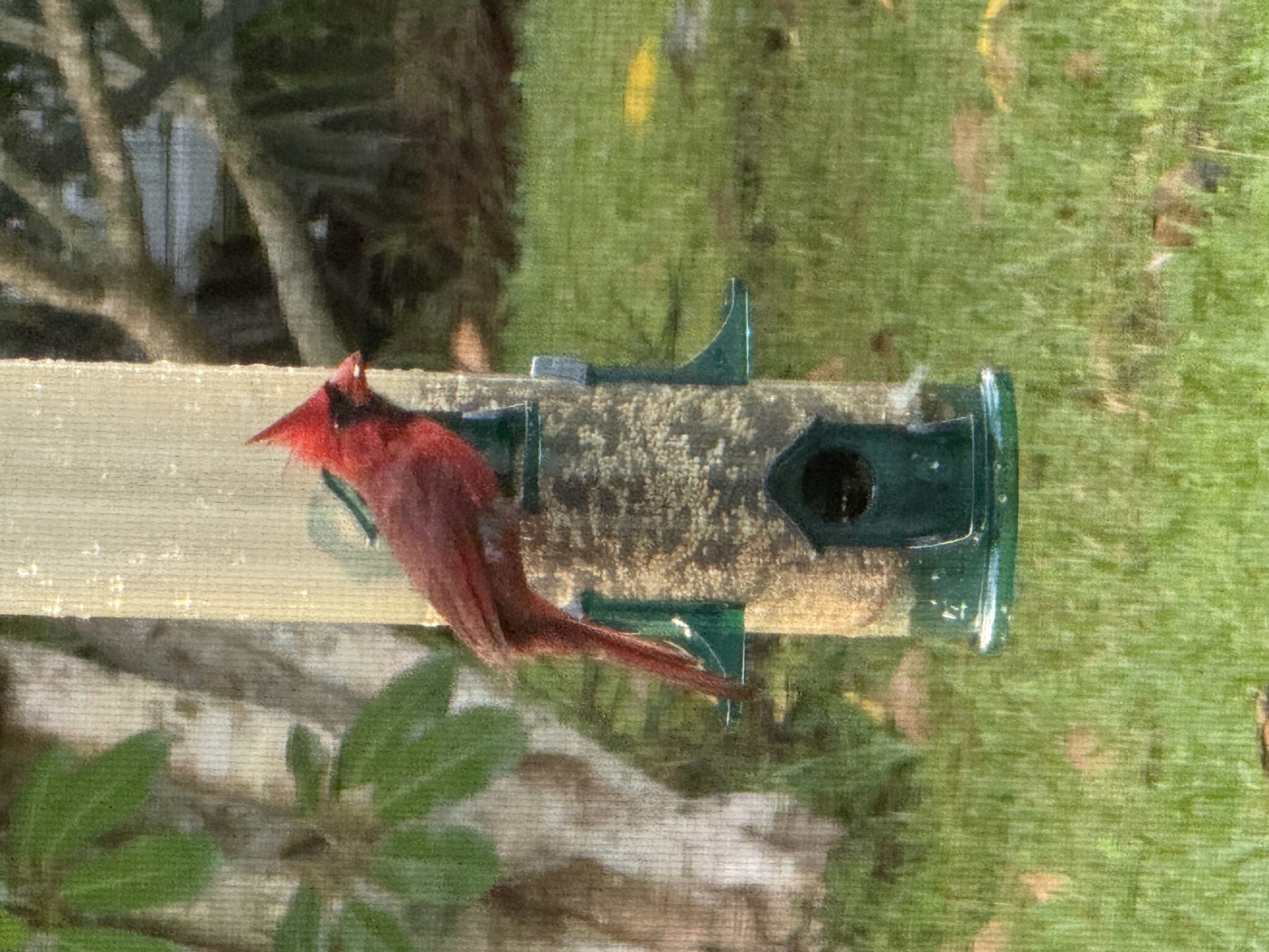 The Red cardinal had not been around for a few weeks. This morning, the female and the male showed up.