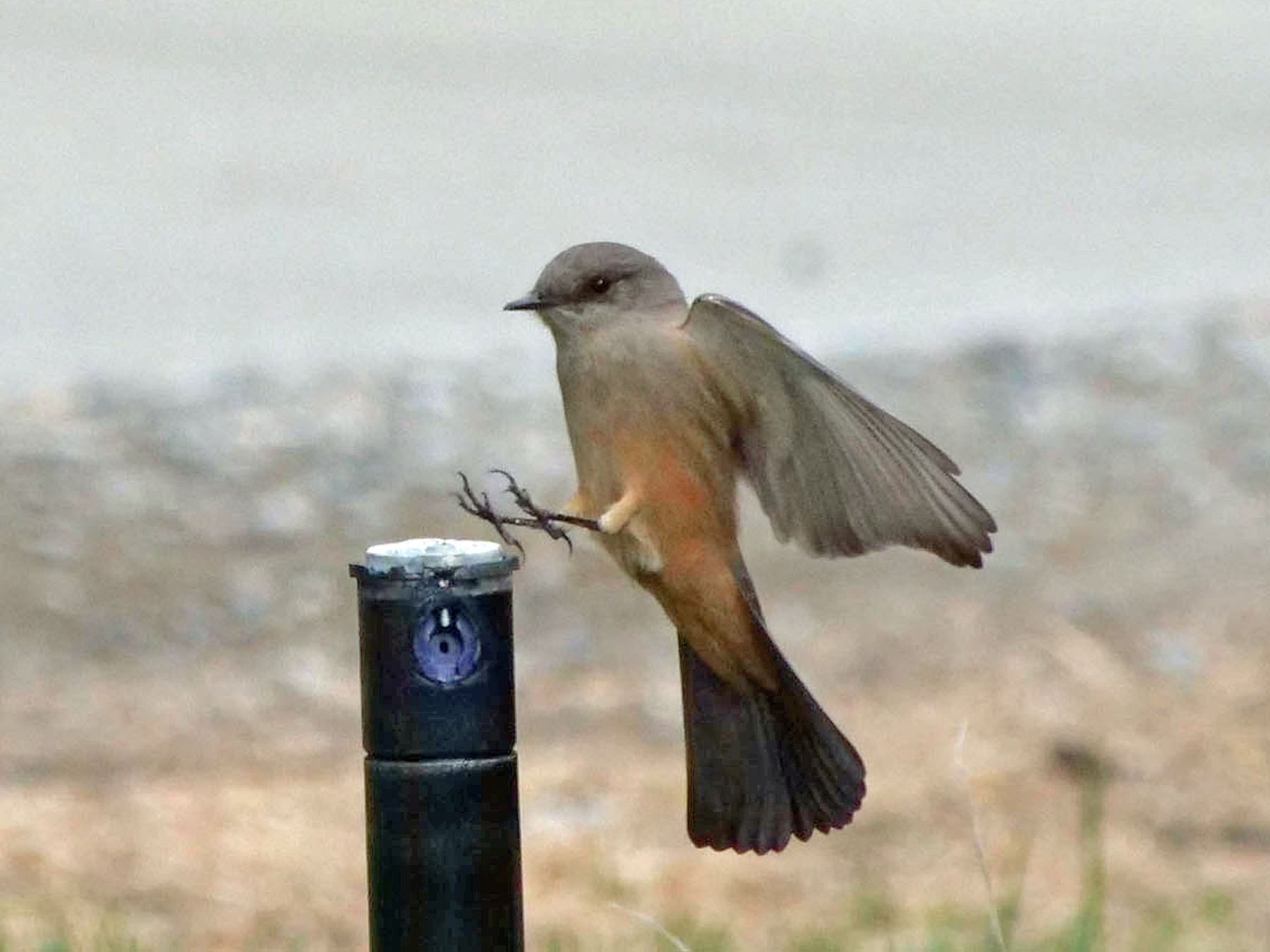 I thought I was taking pictures of a black phoebe until I processed the images. This is a Say’s Phoebe landing on a sprinkler head after nabbing a bug.