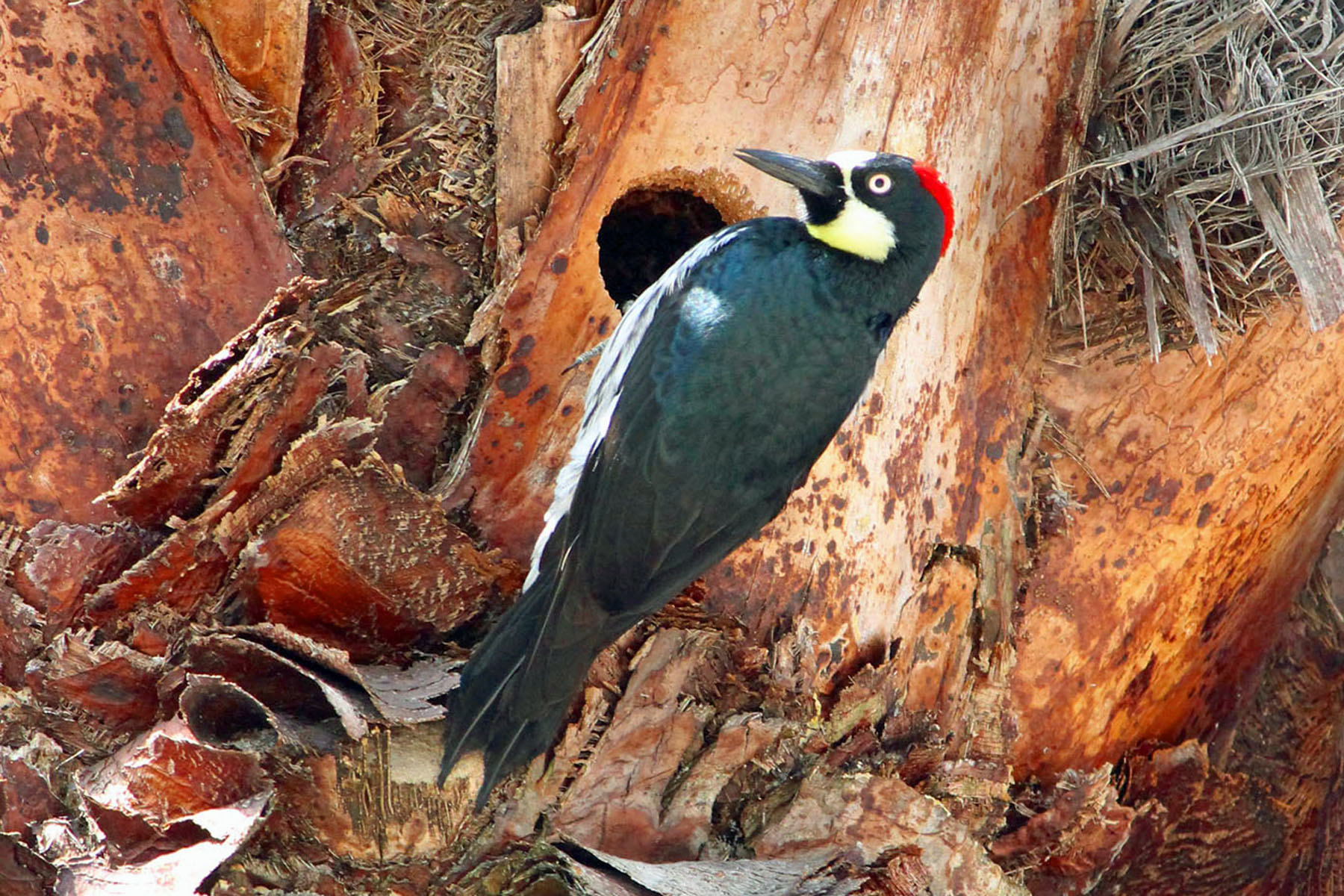 AN acorn woodpecker, cutting a hole in a palm tree. Normally they make holes to store acorns but this hole is so large I think it may be a nest site.