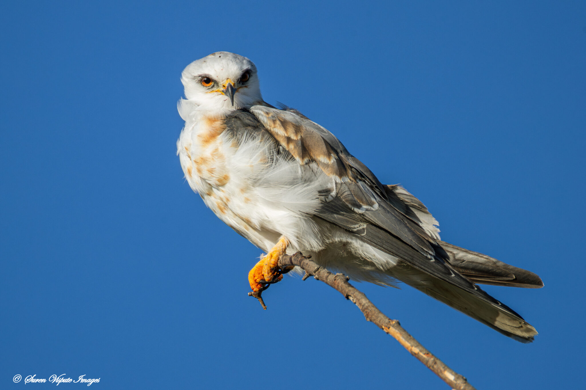 High above, a White-tailed Kite surveys its domain from a towering perch.