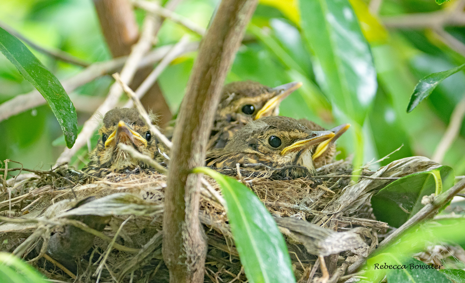Taken through our lounge window to the nest in a Camelia tree with 4 chicks nearly ready to fledge. It was difficult to avoid reflections through the double glazing glass. I have a video of them if I can enter that onto this site that you would enjoy.