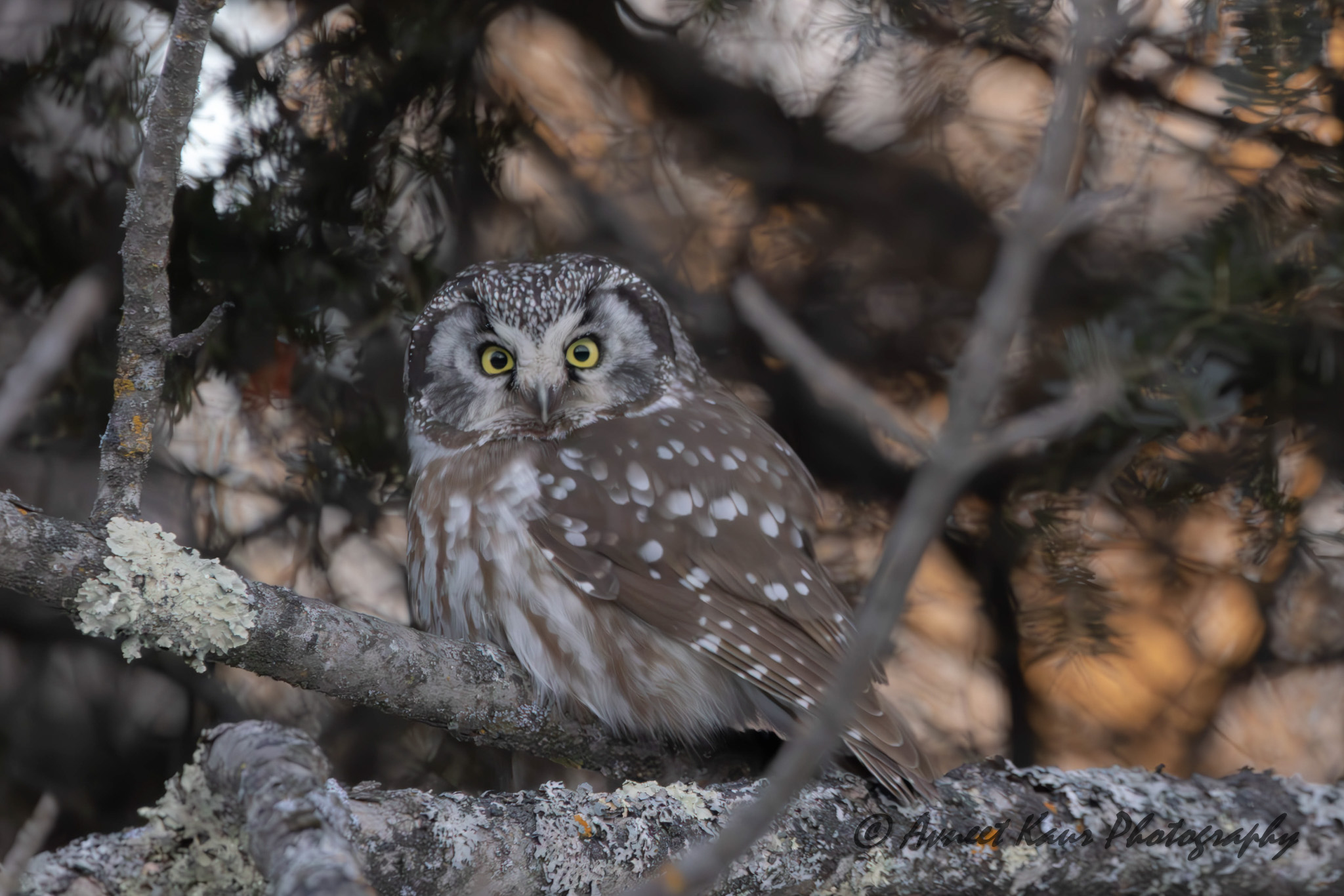 A boreal owl with striking yellow eyes is perched on a lichen-covered branch. The background is a blurred mix of branches and foliage, creating a natural setting!!! January 2025