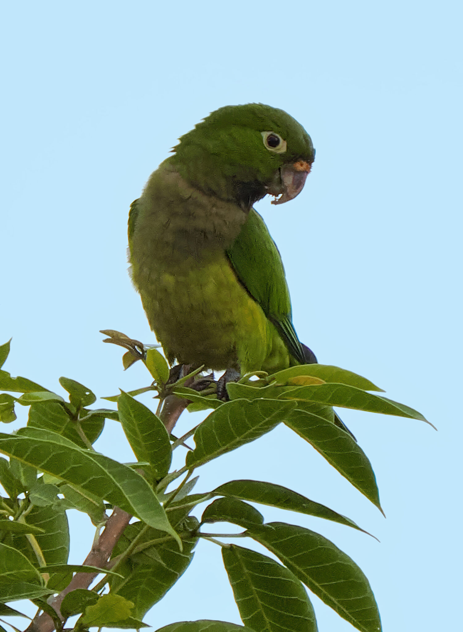 This Olive-throated Parakeet flew to the top of a tree where it perched briefly as we were walking along the access road to Playa Juan Angel. The Aztec subspecies is present in Veracruz.