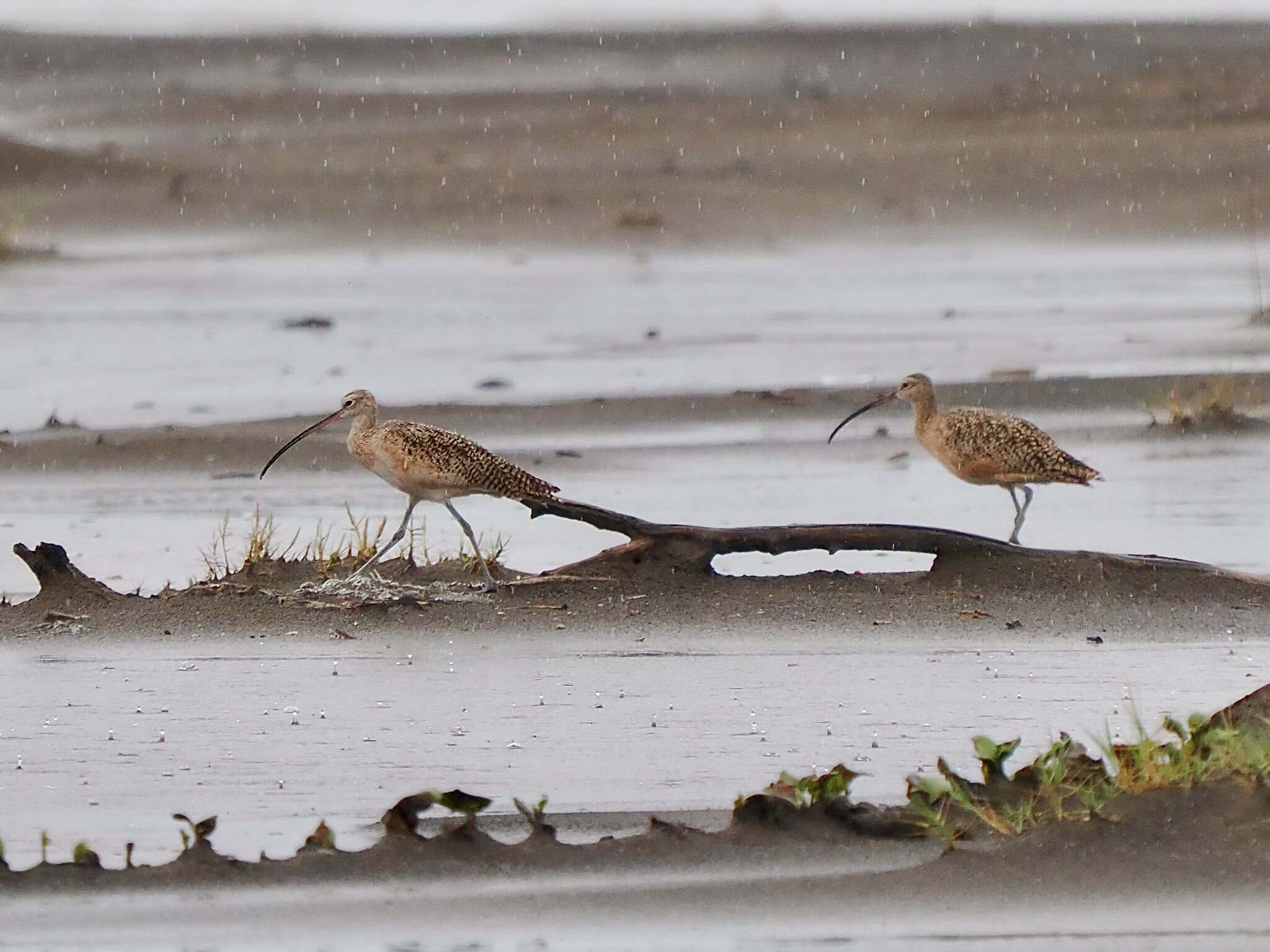 On a gray, rainy morning, we spotted this pair of Long-billed Curlews foraging in shallow ponds that formed along the beach.