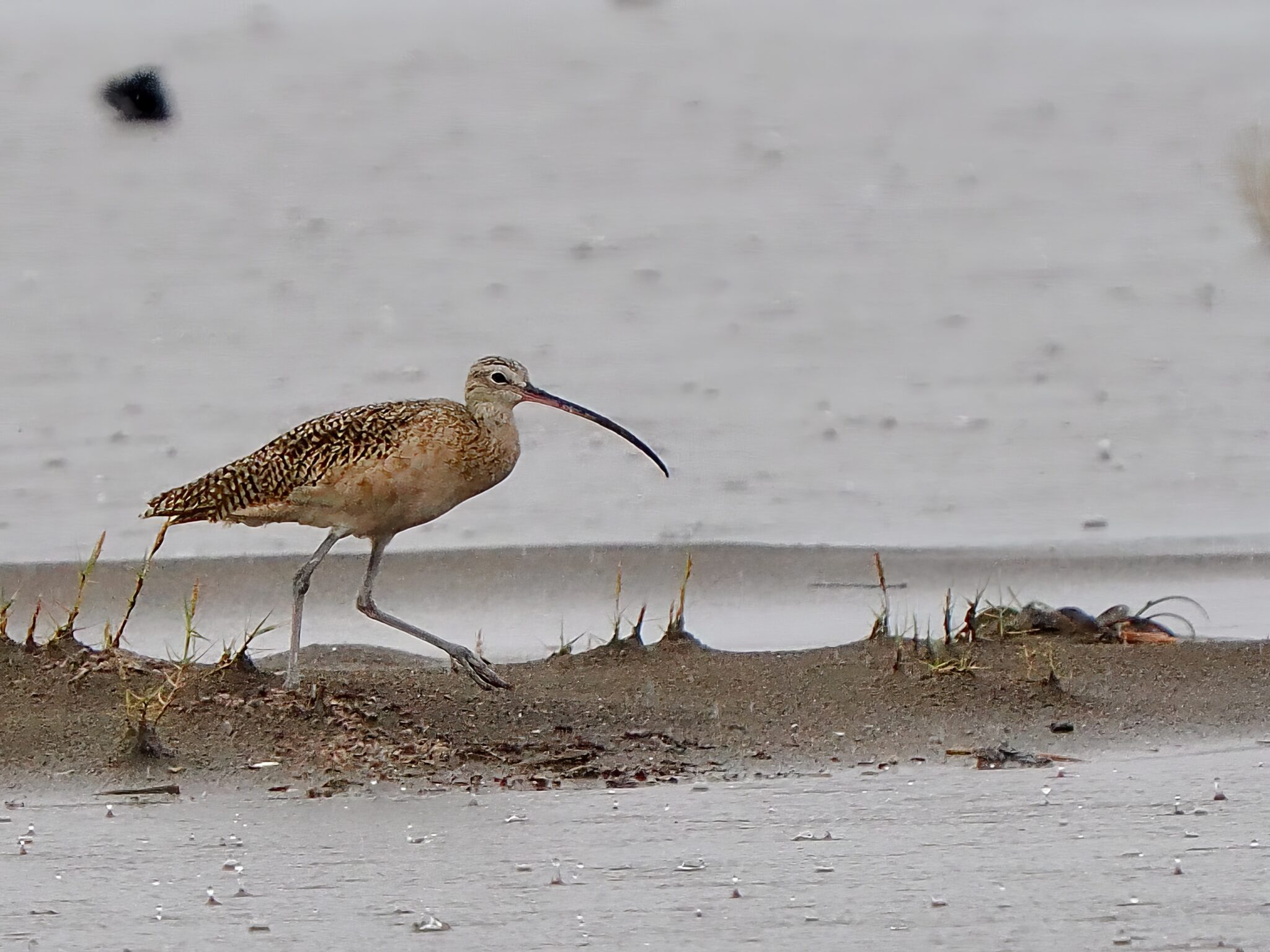 On a gray, rainy morning, we saw a pair of Long-billed Curlews foraging in the distance. This one came a bit closer than the other.