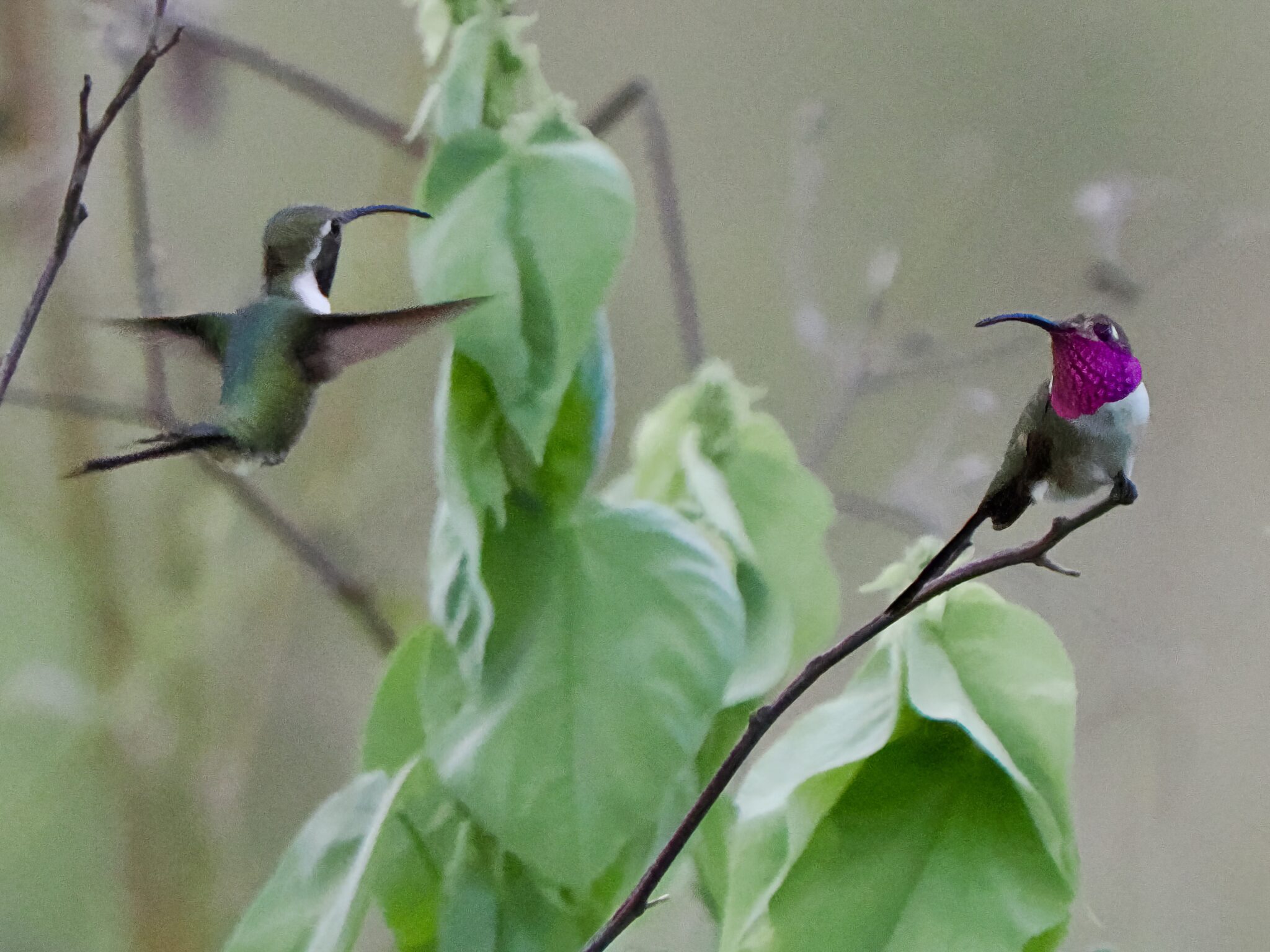 We were walking along El Crucero Road near Cardel on a sunny afternoon, watching the Double-striped Thick-knees in a broad field. A lone tree stood along the fence line and in it was a hummingbird feeder. Our guide said the feeder attracted Mexican Sheartail Hummingbirds that were known to be in the area. I watched the feeder for nearly an hour, seeing only a female Ruby-throated, while the rest of our group walked down the road. As the afternoon progressed toward evening, the Mexican Sheartail Hummingbirds suddenly appeared. It was very neat to observe an approaching male challenge one that was perched.