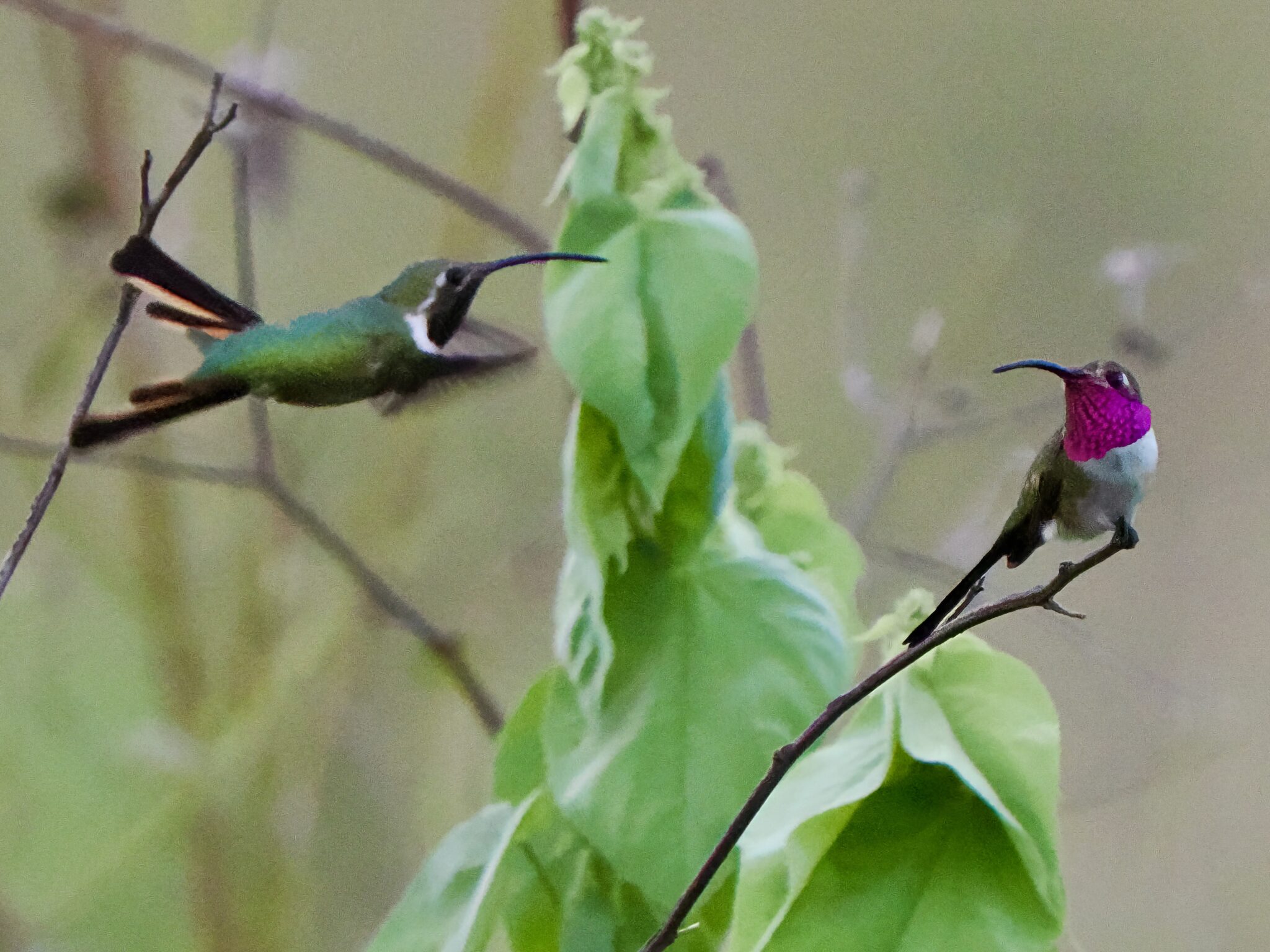 We were walking along El Crucero Road near Cardel on a sunny afternoon, watching the Double-striped Thick-knees in a broad field. A lone tree stood along the fence line and in it was a hummingbird feeder. Our guide said the feeder attracted Mexican Sheartail Hummingbirds that were known to be in the area. I watched the feeder for nearly an hour, seeing only a female Ruby-throated, while the rest of our group walked down the road. As the afternoon progressed toward evening, the Mexican Sheartail Hummingbirds suddenly appeared. It was very neat to observe an approaching male challenge one that was perched.