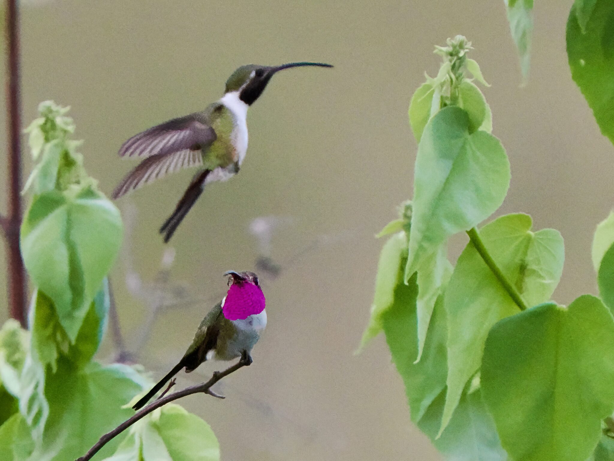 We were walking along El Crucero Road near Cardel on a sunny afternoon, watching the Double-striped Thick-knees in a broad field. A lone tree stood along the fence line and in it was a hummingbird feeder. Our guide said the feeder attracted Mexican Sheartail Hummingbirds that were known to be in the area. I watched the feeder for nearly an hour, seeing only a female Ruby-throated, while the rest of our group walked down the road. As the afternoon progressed toward evening, the Mexican Sheartail Hummingbirds suddenly appeared. It was very neat to observe an approaching male challenge one that was perched.