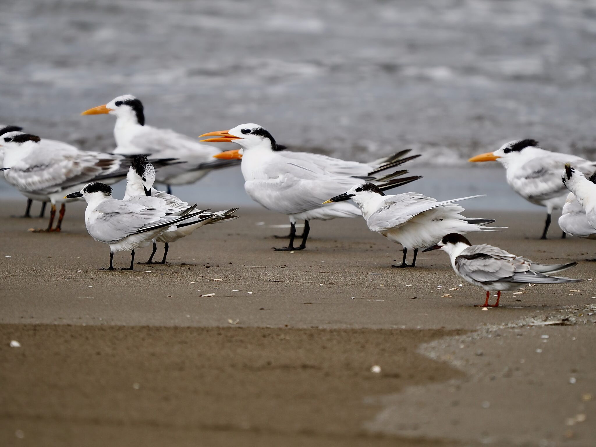 It was interesting to see this mixed flock of terns hanging out on the beach together, which allowed for a handy side-by-side comparison. The Royal is the largest with the orange bill, the Sandwich is medium sized with a yellow-tipped black bill, and the Common is the smallest with the solid black bill.