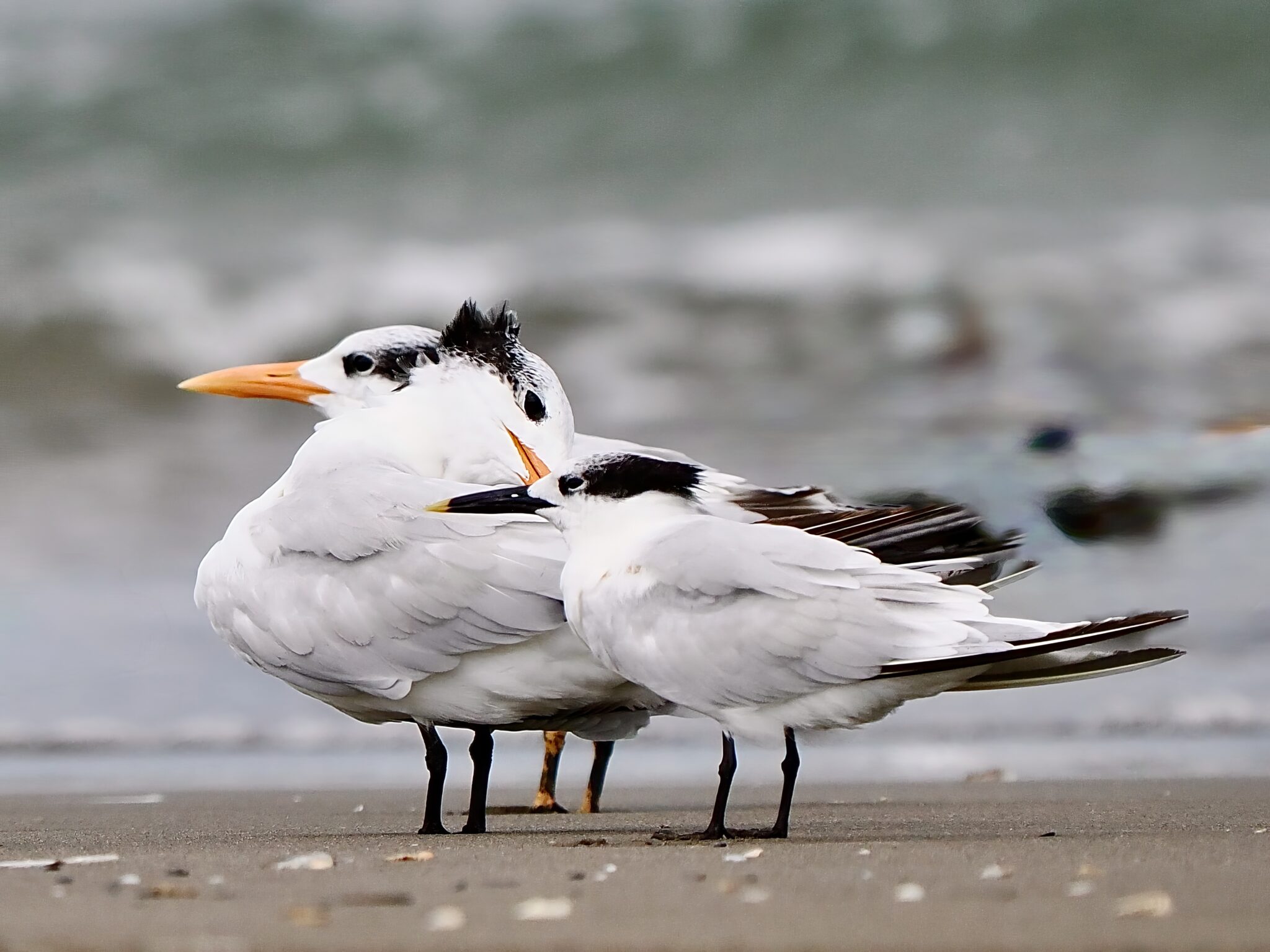 I was surprised by the significant size difference between the large Royal Tern and the Sandwich Tern with its yellow-tipped black bill.