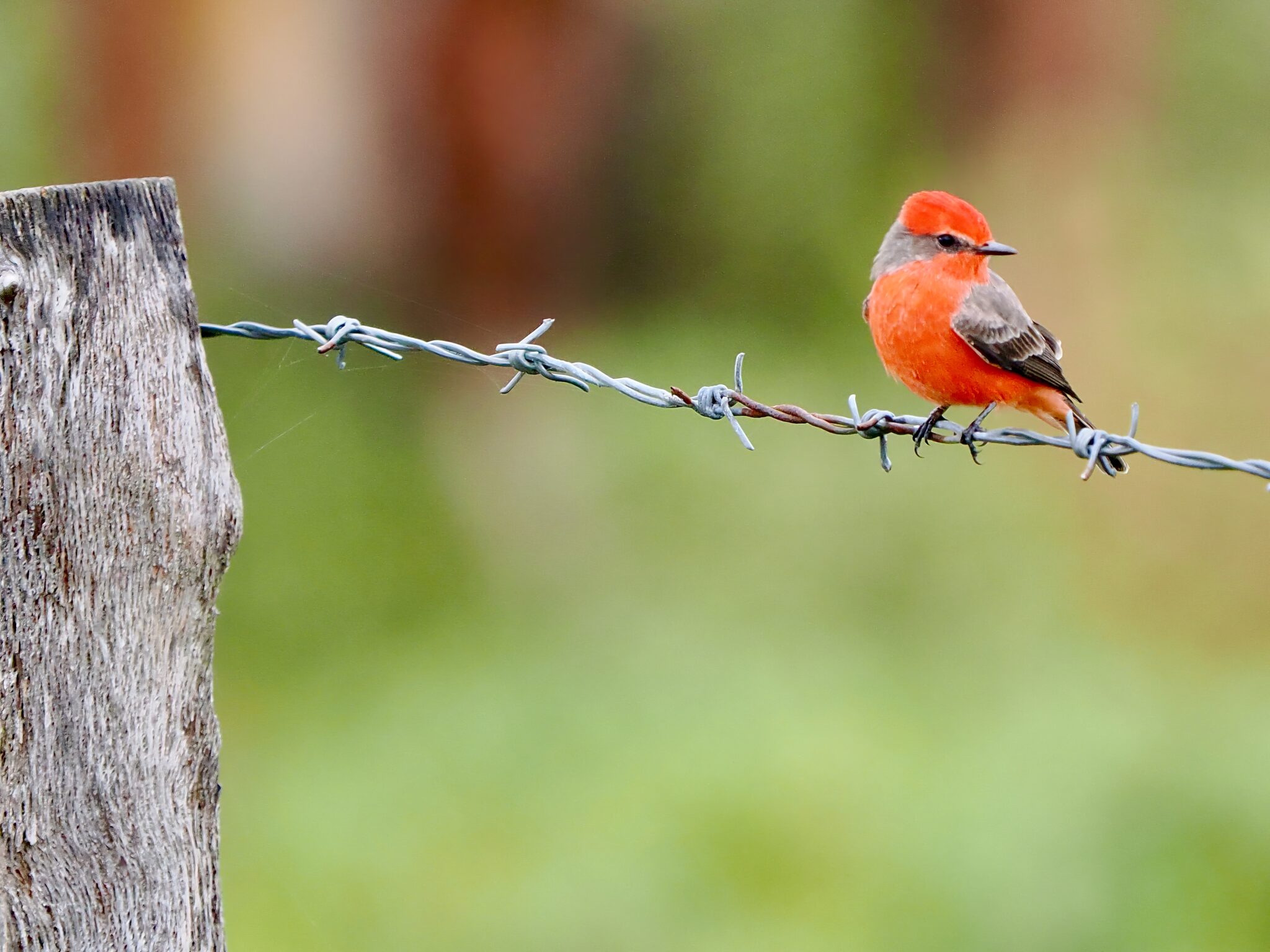 This Vermilion Flycatcher was perched on a fence around a cattle yard. The female was nearby.