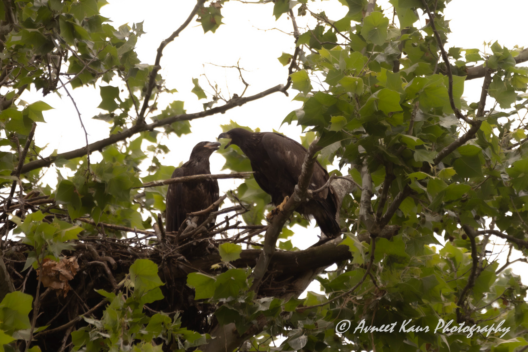 Two juvenile bald eagle chicks are seen perched on a branch, nestled among dense green foliage. The scene captures a moment of interaction between the birds!!! Dayton – Ohio; June 2025