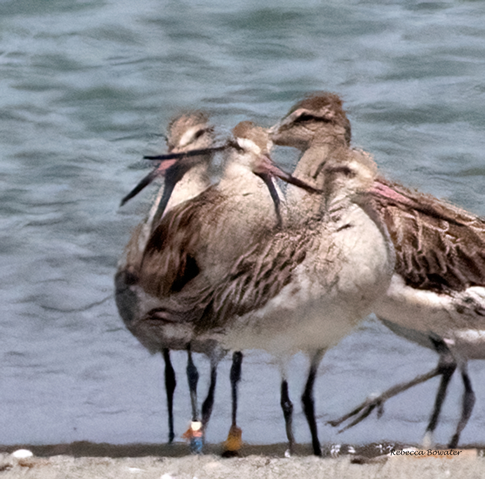 Bar-tailed Godwit arrived back on Motueka sandspit on the 5th November 2025 4RYRB was banded and satelite-tagged on 29 November 2019 at the Ohau Estuary, in the North Island. Note the wire from the satelite can be seen on the left of this image