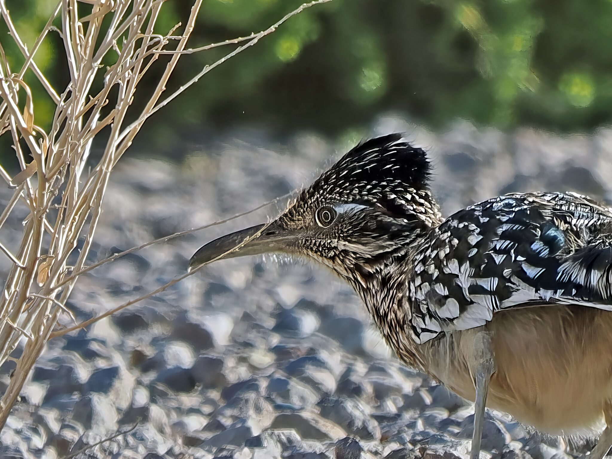 We watched this Greater Roadrunner hunting in the grasses and bushes along a gravel path near the Las Vegas Wash.