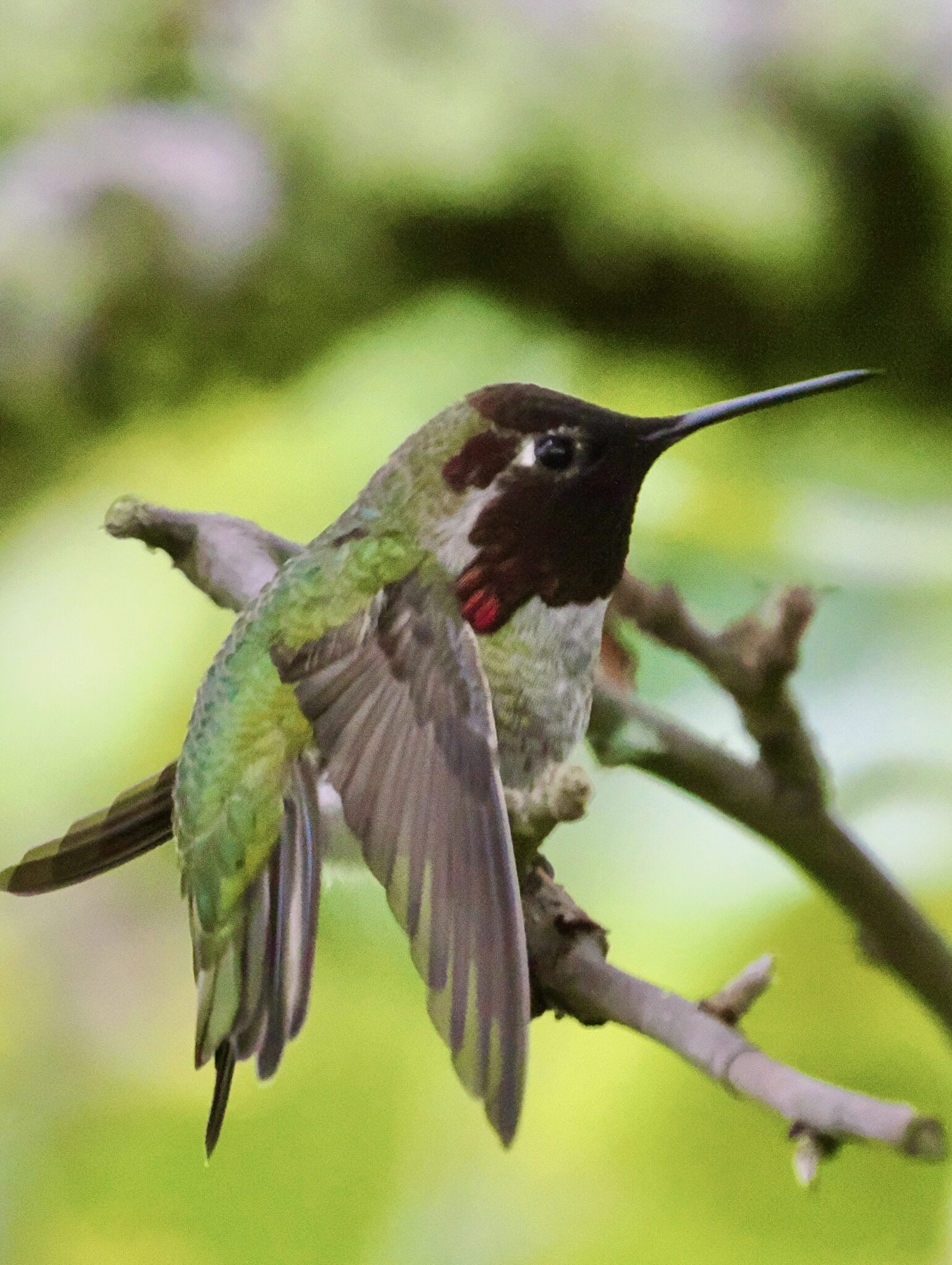 The first few days of November we were in Las Vegas and observed several Anna’s Hummingbirds at feeders. Two weeks later I was in the San Francisco area and went to the Filoli Gardens with my daughter. There were many Anna’s Hummingbirds chasing each other around the garden grounds. As the park was closing for the day, I ran into a couple who were staring into the middle of a small tree where this Anna’s was perched. A wonderful spot!