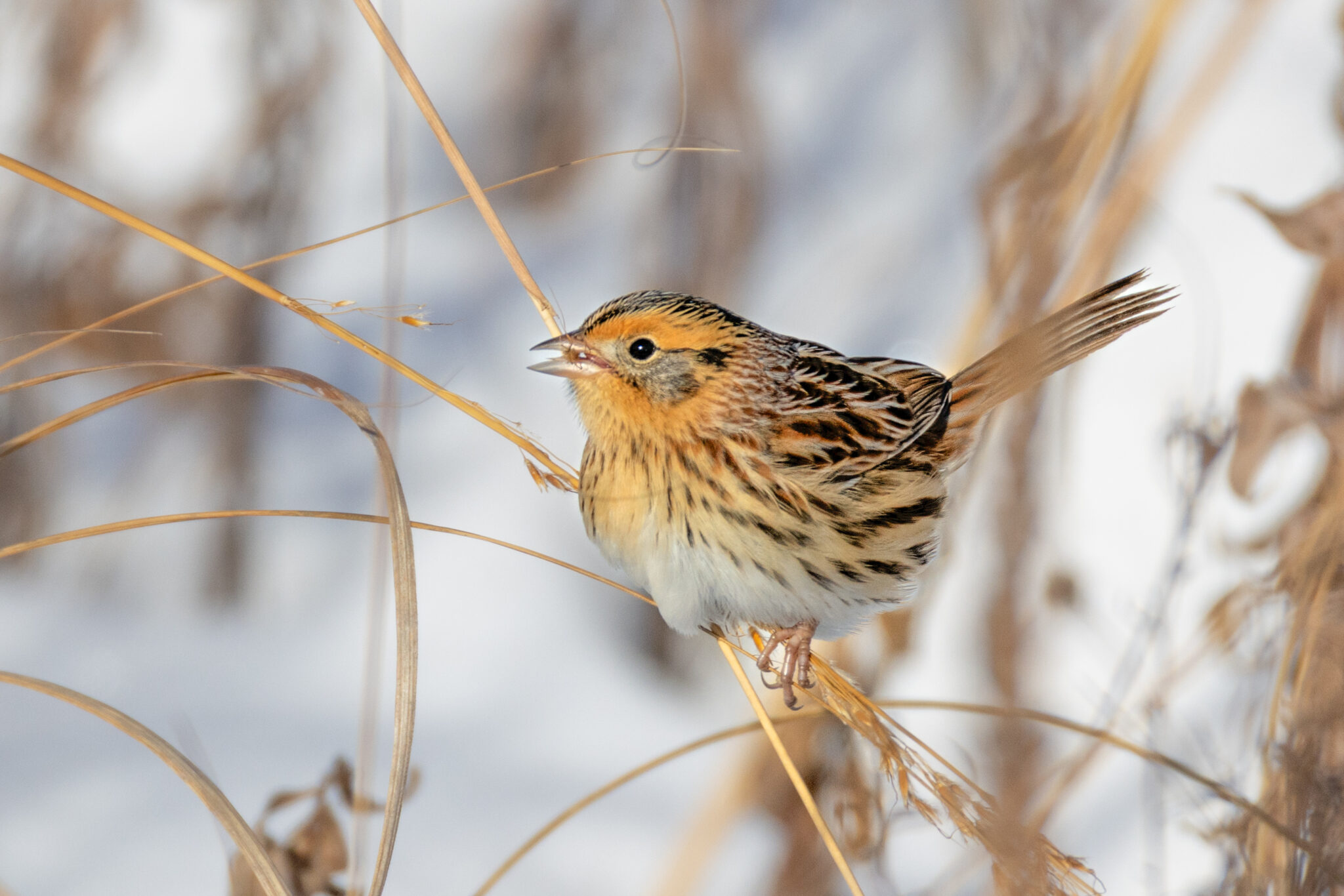 Last year in October, two LeConte’s Sparrows showed up at Fort Sheridan FP in Lake Forest IL. I was lucky enough, along with a lot of others, to find and photograph them. So, this October and early November I was definitely on the lookout for them. They never appeared. Now, in the first week of December, here are two LeConte’s sparrows in the same exact spot, feeding on the same exact grass seeds as last year. Two different birds? Seems unlikely. Birds are truly amazing.