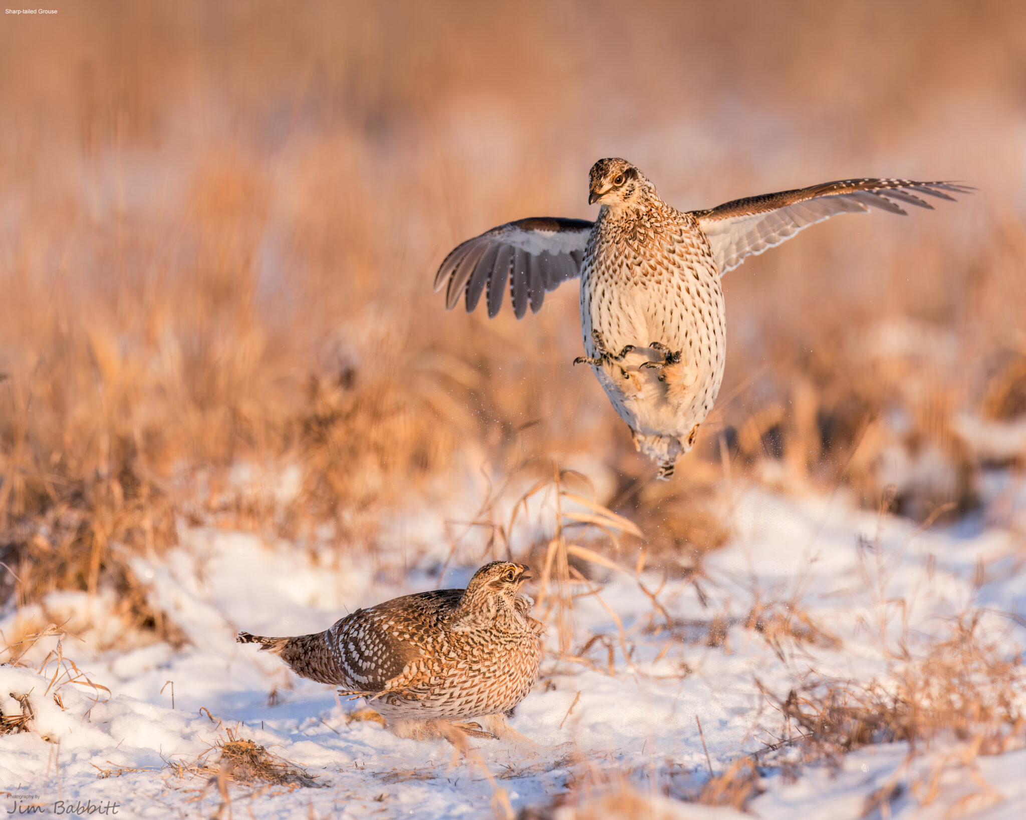 Sharp tailed Grouse displaying at a lek on a cold, snowy morning