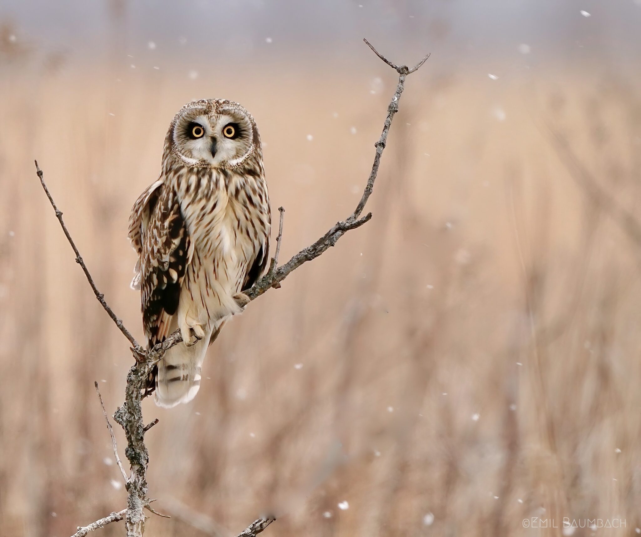 This Short Eared Owl is taking a break from hunting during a snow flurry. The snow flakes give the scene a nice winter flavor.