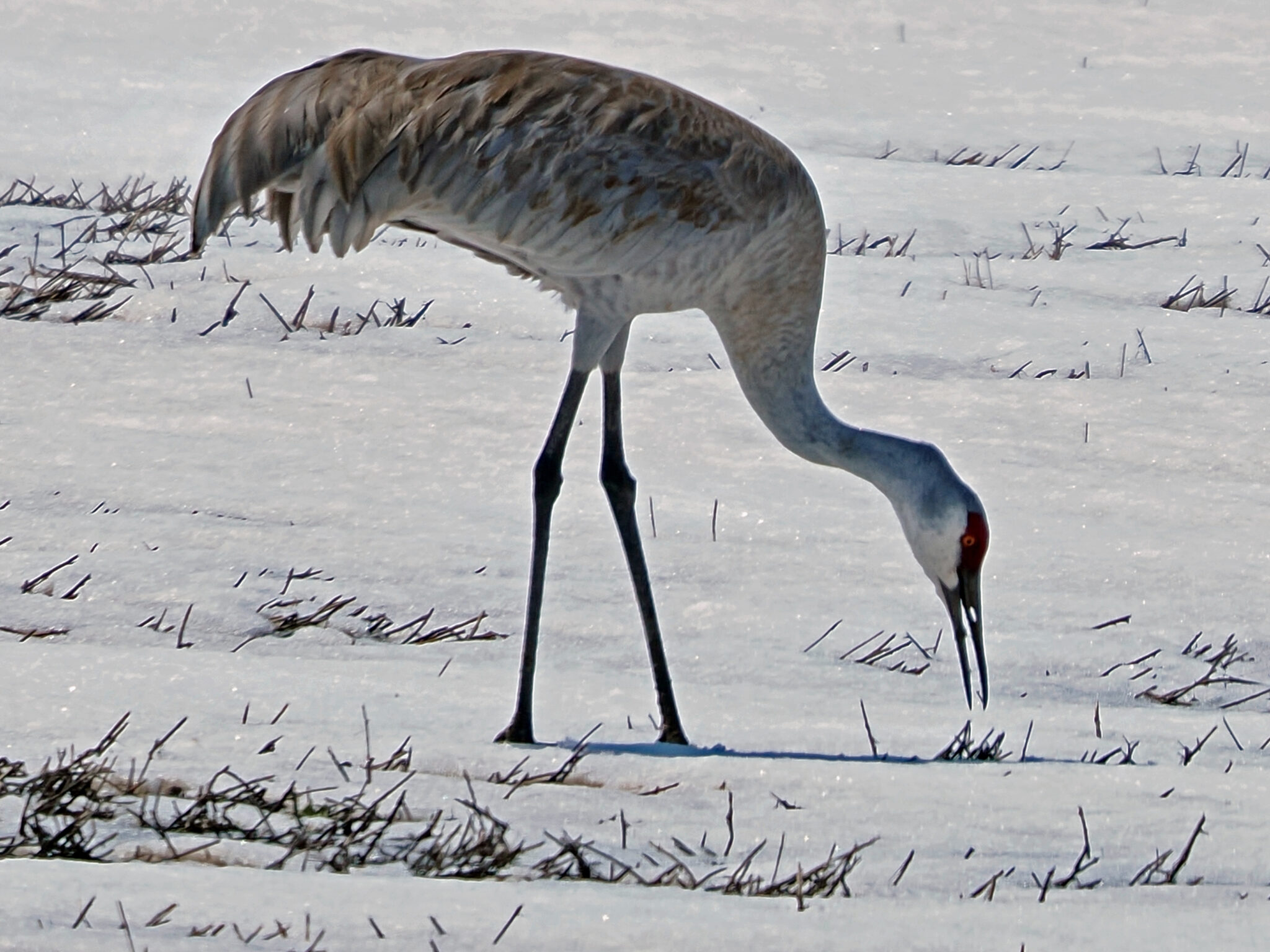 We watched a small group of Sandhill Cranes foraging a snowy field.