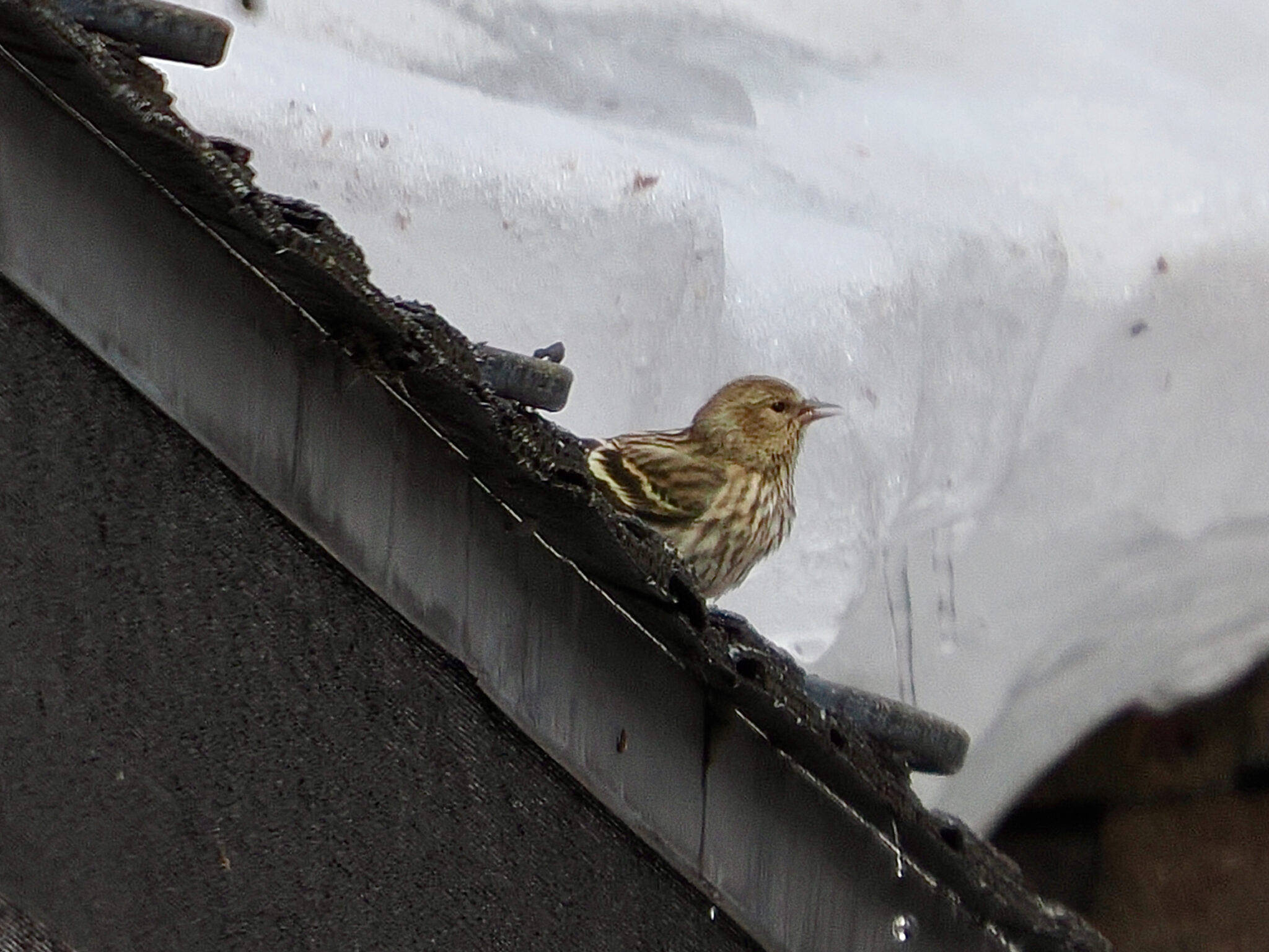 A pair of Pine Siskins were sitting on the edge of a roof, waiting for their turn at a feeder. One of them flew down just before I took this picture.