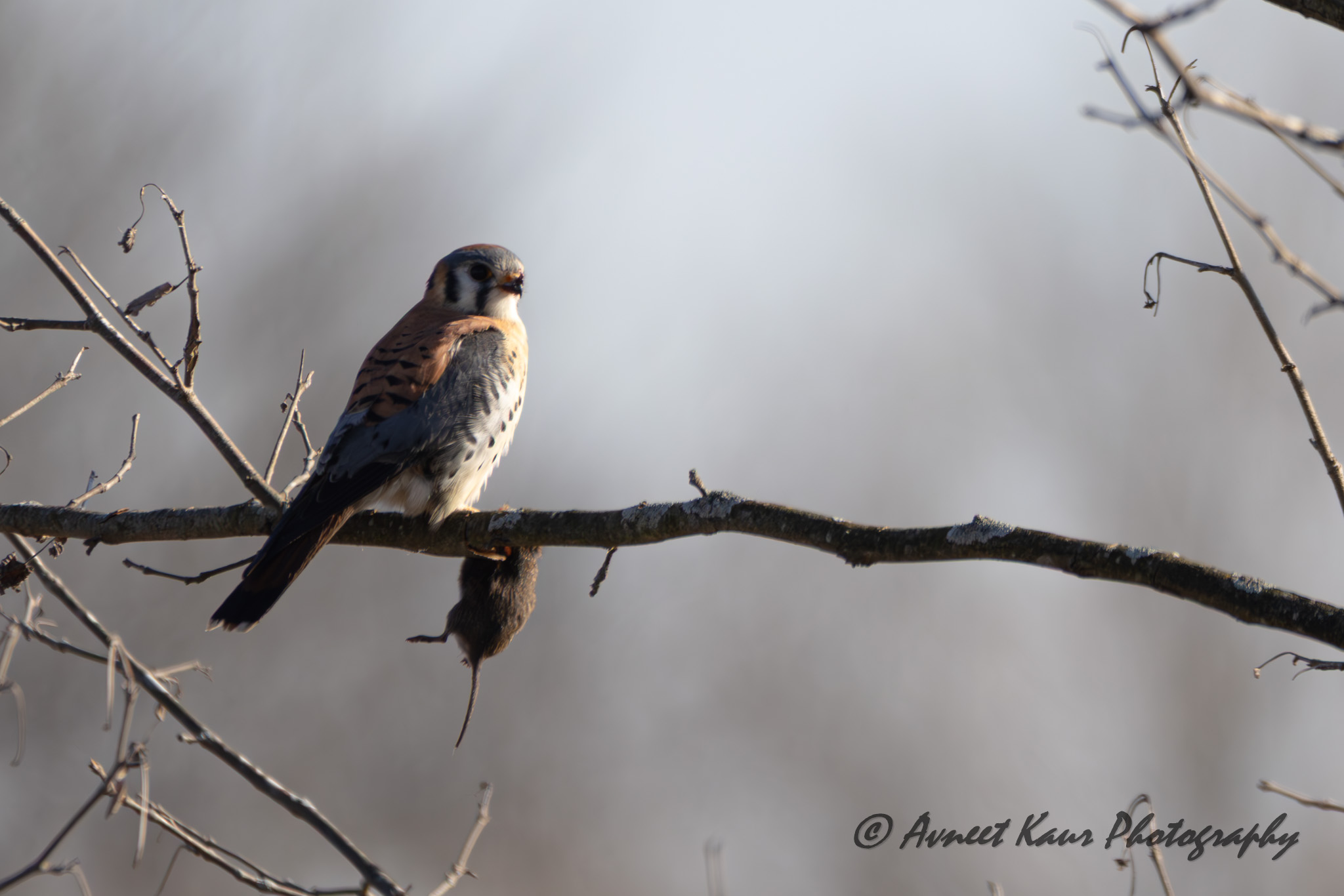 An American Kestrel perches on a bare branch, holding its prey firmly. The background is softly blurred, highlighting the bird’s sharp features!!! Hamilton – Ohio; December 9, 2025